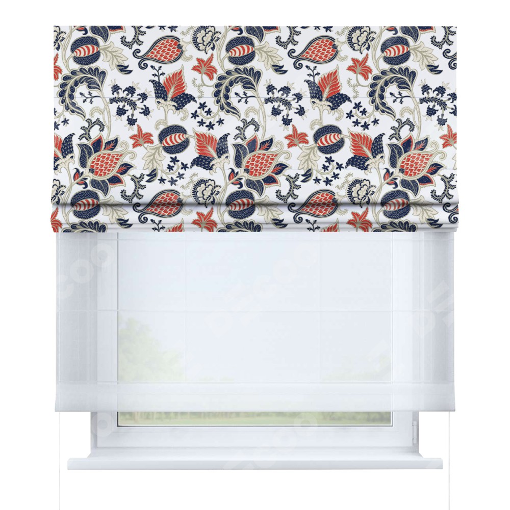 Римская штора день-ночь производителя «Cortin», используется для проёма, пошита из двух полотен, с лицевой блэкаут с нанесением сублимационной печати «Пёстрые цветы», вторая ткань тюль (по стандарту комплектуется тюль белого цвета артикул V-01). Имеет универсальный механизм и подходит для монтажа: на потолок, на стену и в нишу.