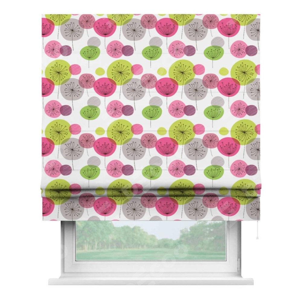 Римская штора производителя «Cortin», используется для проёма, пошита из ткани блэкаут с нанесением сублимационной печати «Цветные одуванчики». Имеет универсальный механизм и подходит для монтажа: на потолок, на стену и в нишу.