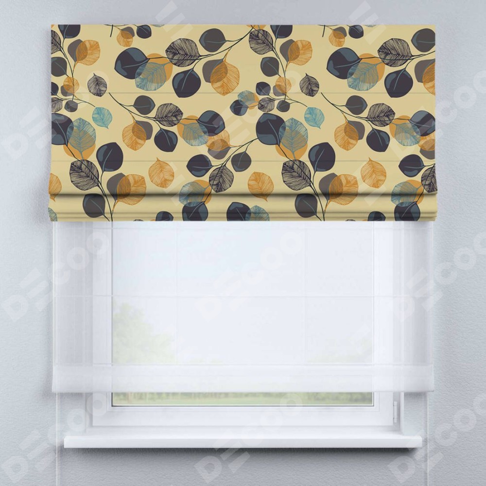 Римская штора день-ночь производителя «Cortin», используется для проёма, пошита из двух полотен, с лицевой блэкаут с нанесением сублимационной печати «Листья в янтаре», вторая ткань тюль (по стандарту комплектуется тюль белого цвета артикул V-01). Имеет универсальный механизм и подходит для монтажа: на потолок, на стену и в нишу.