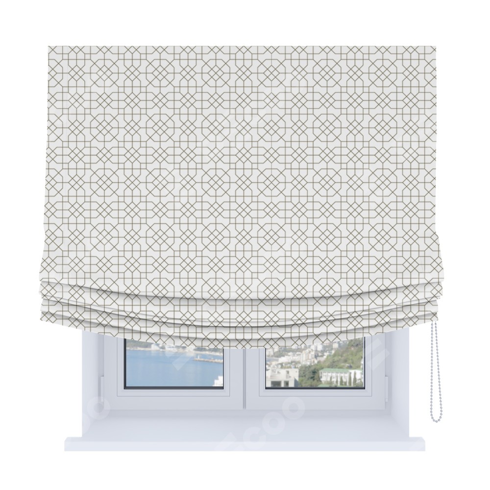 Римская штора Soft производителя «Cortin», используется для проёма, пошита из ткани блэкаут с нанесением сублимационной печати «Орнамент из тонких линий». Имеет универсальный механизм и подходит для монтажа: на потолок, на стену и в нишу. В отличие от стандартных римских штор, римская штора Soft не имеет горизонтальных вставок и нижнего отвеса. Это позволяет ткани произвольно драпироваться в свободные мягкие складки.