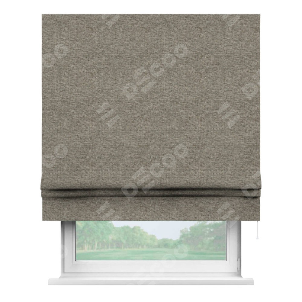 Римская штора производителя «Cortin», используется для проёма, пошита из ткани стиф димаут серо-коричневый, артикул ткани 44028. Имеет универсальный механизм и подходит для монтажа: на потолок, на стену и в нишу.