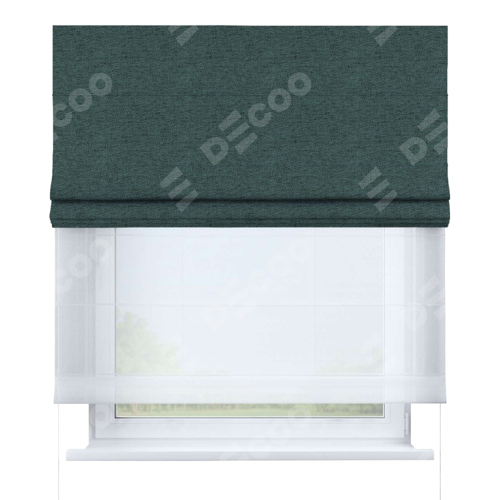 Римская штора день-ночь производителя «Cortin», используется для проёма, пошита из двух полотен, с лицевой стороны стиф димаут сине-зелёный артикул 18194, вторая ткань тюль (по стандарту комплектуется тюль белого цвета артикул V-01). Имеет универсальный механизм и подходит для монтажа: на потолок, на стену и в нишу.