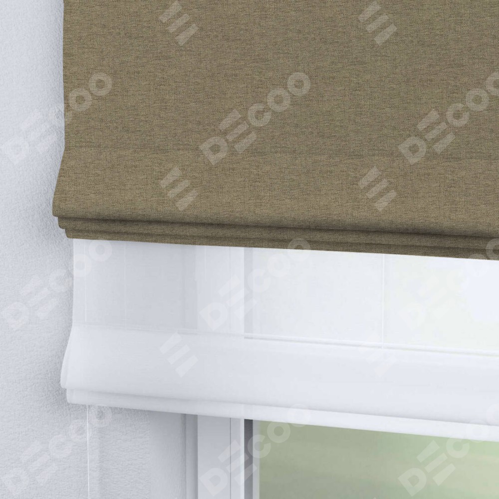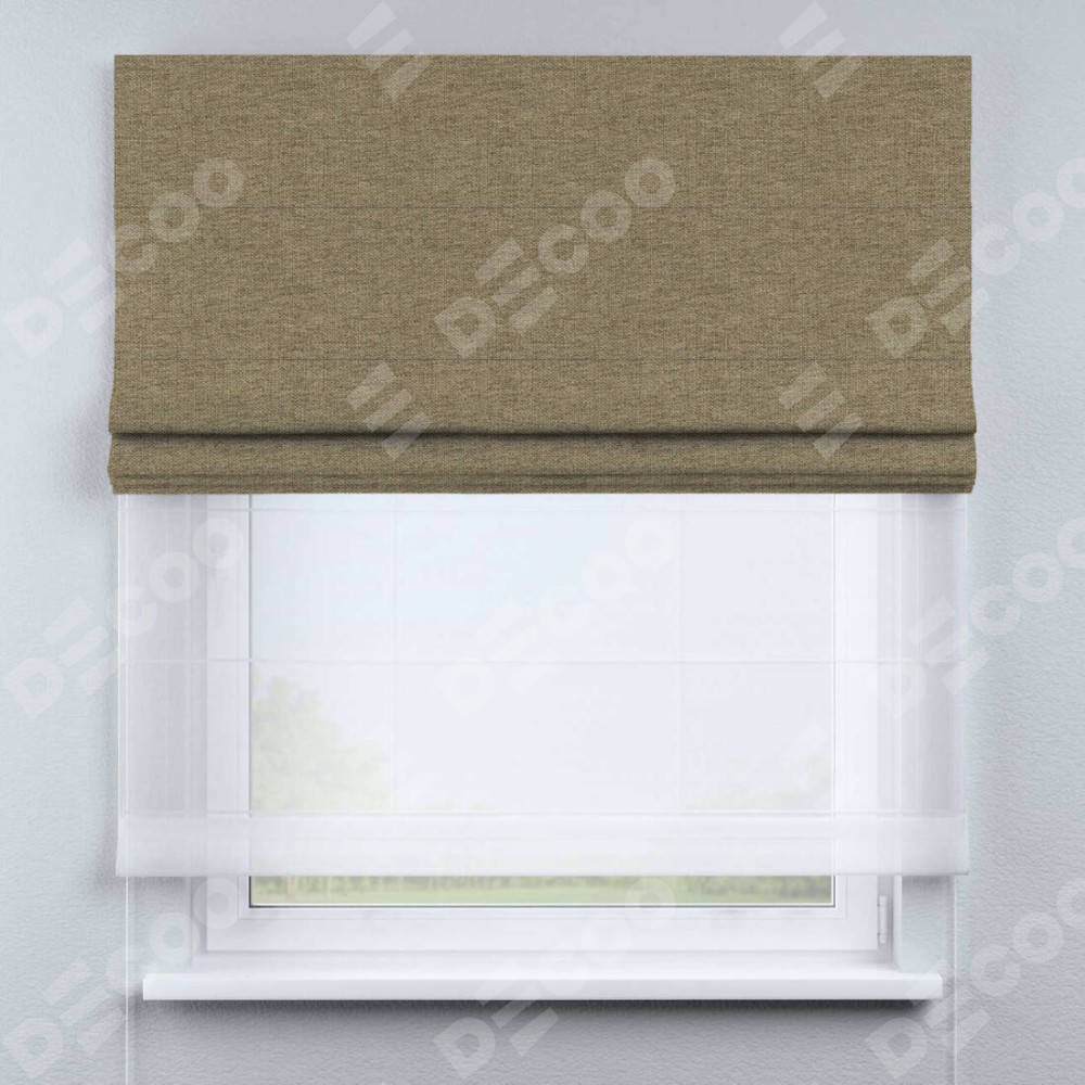 Римская штора день-ночь производителя «Cortin», используется для проёма, пошита из двух полотен, с лицевой стороны стиф димаут тёмно-бежевый артикул 18085, вторая ткань тюль (по стандарту комплектуется тюль белого цвета артикул V-01). Имеет универсальный механизм и подходит для монтажа: на потолок, на стену и в нишу.