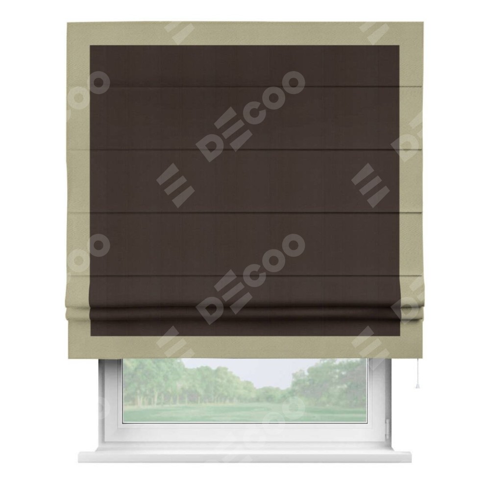 Римская штора производителя «Cortin», используется для проёма, пошита из ткани блэкаут однотонный венге, артикул ткани 88286. Отделка шторы кантом «Чесс», ткань для канта используется из блэкаута однотонного разной расцветки на выбор. Имеет универсальный механизм и подходит для монтажа: на потолок, на стену и в нишу.
