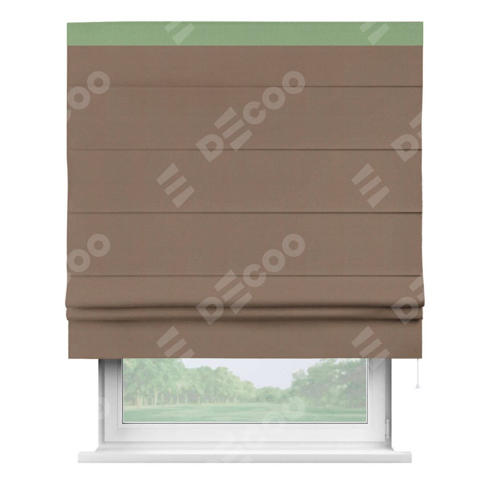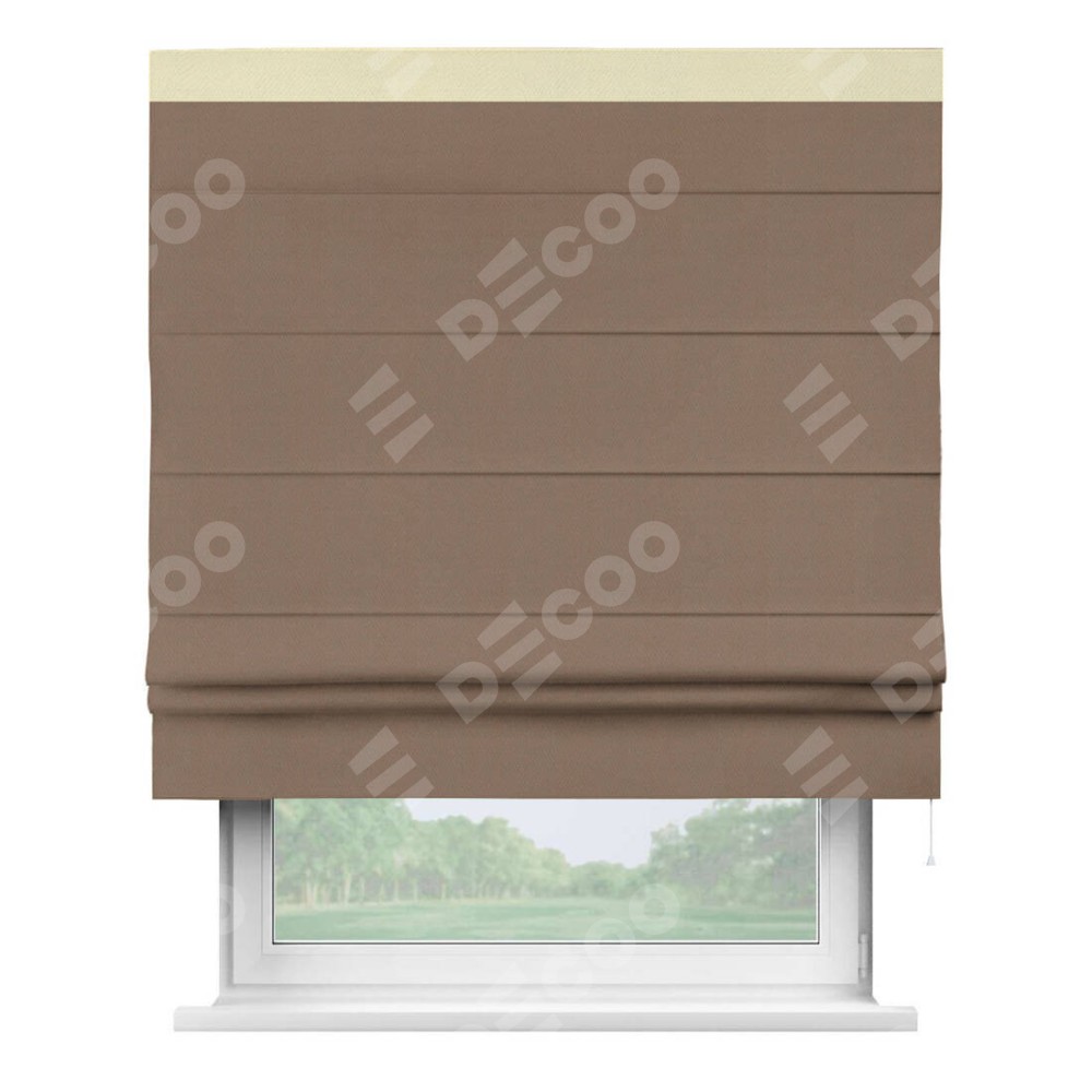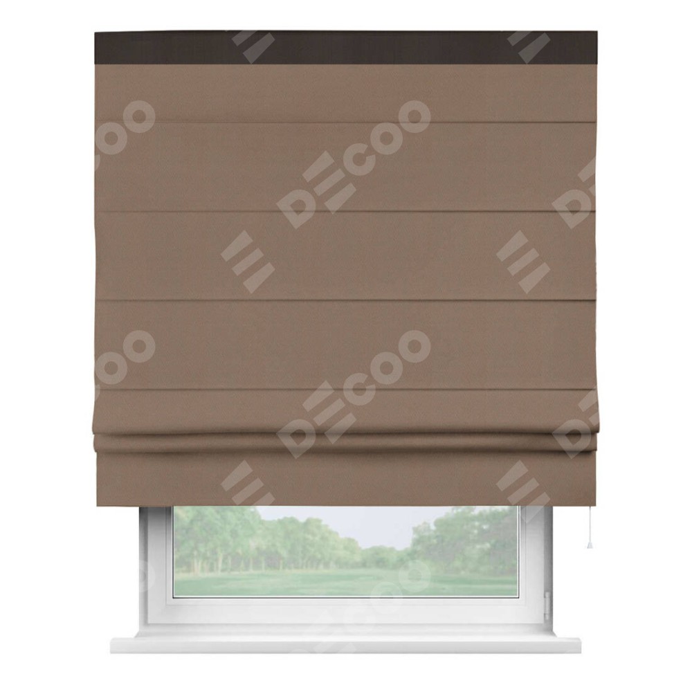 Римская штора производителя «Cortin», используется для проёма, пошита из ткани блэкаут однотонный коричневый, артикул ткани 88285. Отделка шторы кантом «Кинг», ткань для канта используется из блэкаута однотонного разной расцветки на выбор. Имеет универсальный механизм и подходит для монтажа: на потолок, на стену и в нишу.