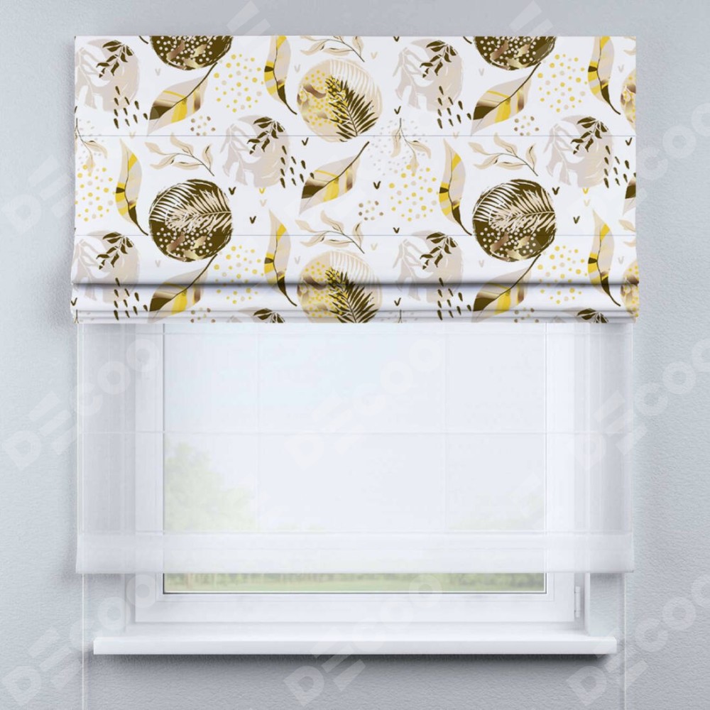 Римская штора день-ночь производителя «Cortin», используется для проёма, пошита из двух полотен, с лицевой блэкаут с нанесением сублимационной печати «Золотые листья», вторая ткань тюль (по стандарту комплектуется тюль белого цвета артикул V-01). Имеет универсальный механизм и подходит для монтажа: на потолок, на стену и в нишу.