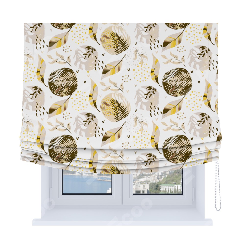 Римская штора Soft производителя «Cortin», используется для проёма, пошита из ткани блэкаут с нанесением сублимационной печати «Золотые листья». Имеет универсальный механизм и подходит для монтажа: на потолок, на стену и в нишу. В отличие от стандартных римских штор, римская штора Soft не имеет горизонтальных вставок и нижнего отвеса. Это позволяет ткани произвольно драпироваться в свободные мягкие складки.