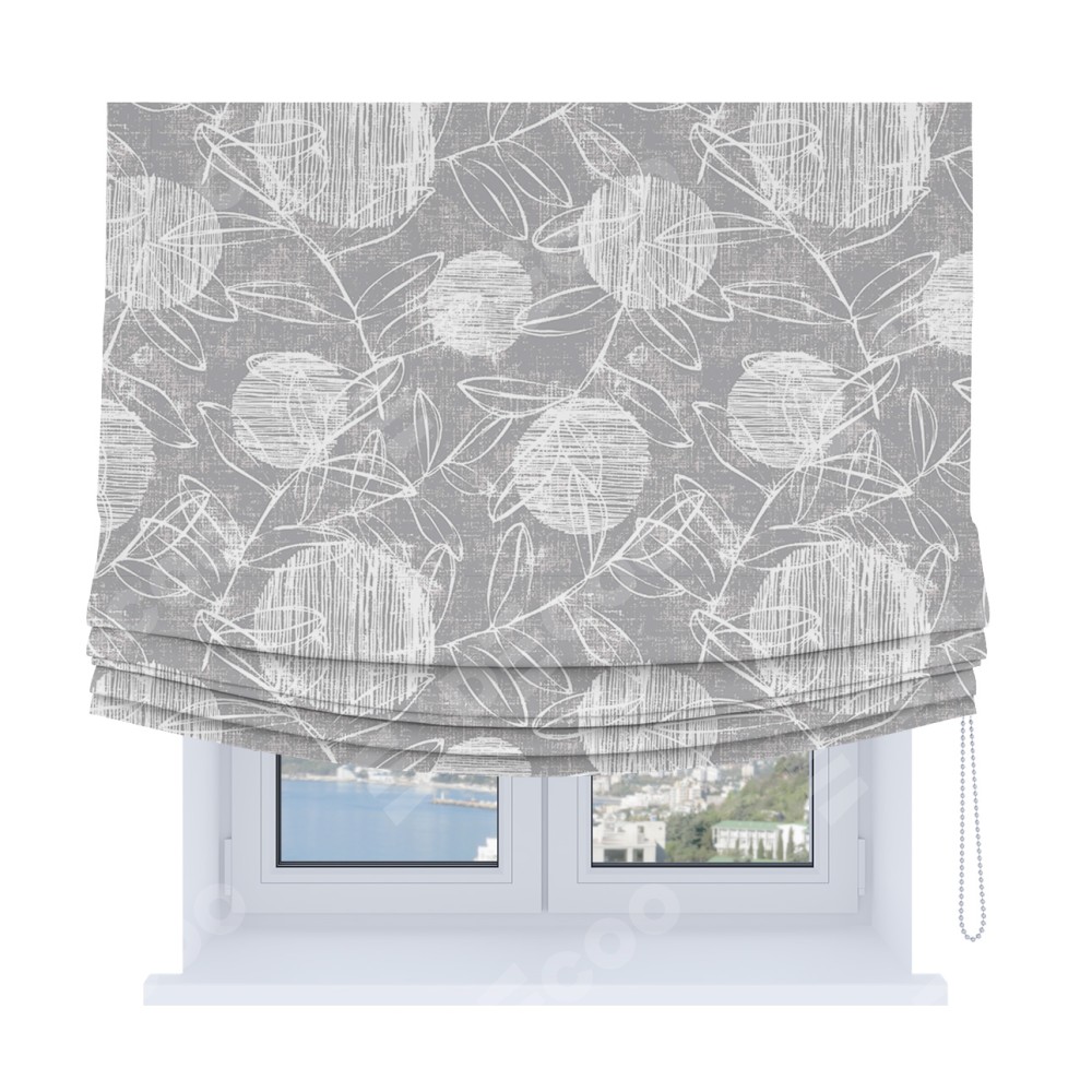 Римская штора Soft производителя «Cortin», используется для проёма, пошита из ткани блэкаут с нанесением сублимационной печати «Серо-белая фантазия». Имеет универсальный механизм и подходит для монтажа: на потолок, на стену и в нишу. В отличие от стандартных римских штор, римская штора Soft не имеет горизонтальных вставок и нижнего отвеса. Это позволяет ткани произвольно драпироваться в свободные мягкие складки.