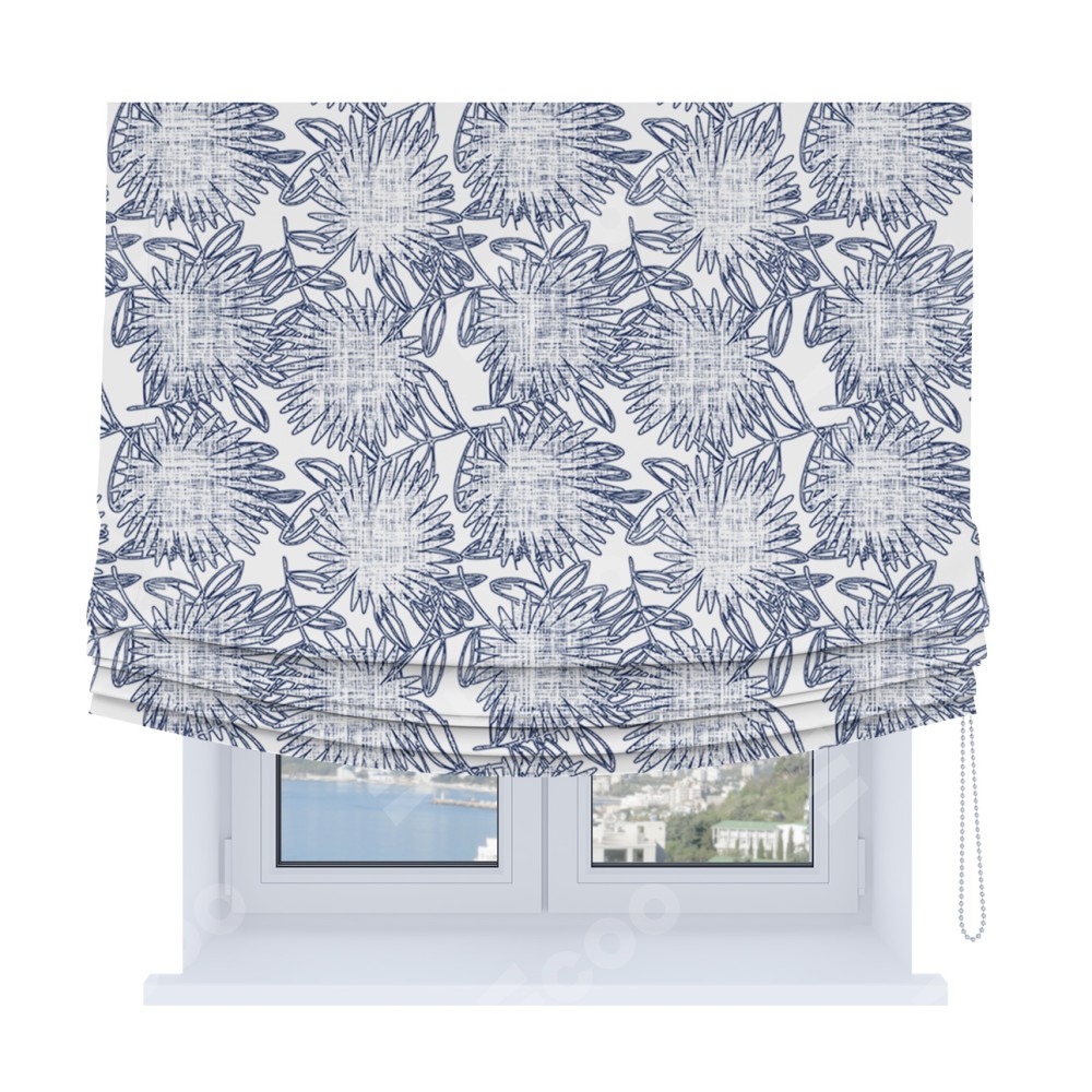 Римская штора Soft производителя «Cortin», используется для проёма, пошита из ткани блэкаут с нанесением сублимационной печати «Синий букет». Имеет универсальный механизм и подходит для монтажа: на потолок, на стену и в нишу. В отличие от стандартных римских штор, римская штора Soft не имеет горизонтальных вставок и нижнего отвеса. Это позволяет ткани произвольно драпироваться в свободные мягкие складки.