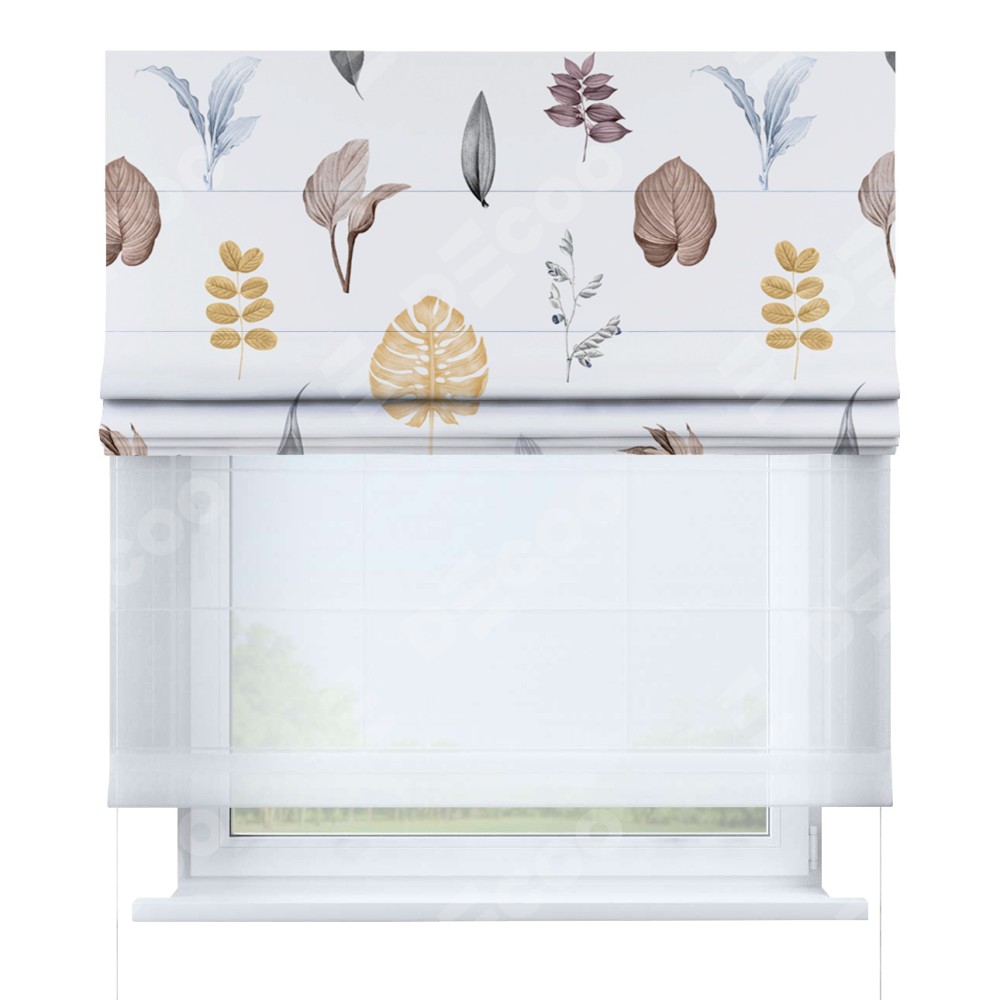 Римская штора день-ночь производителя «Cortin», используется для проёма, пошита из двух полотен, с лицевой блэкаут с нанесением сублимационной печати «Осенний коллаж», вторая ткань тюль (по стандарту комплектуется тюль белого цвета артикул V-01). Имеет универсальный механизм и подходит для монтажа: на потолок, на стену и в нишу.