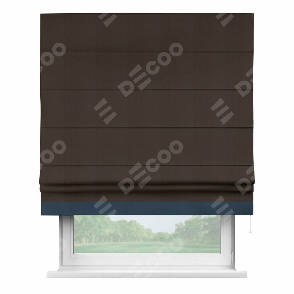 Римская штора производителя «Cortin», используется для проёма, пошита из ткани блэкаут однотонный тёмно-коричневый, артикул ткани 88287. Отделка шторы кантом «Джестер», ткань для канта используется из блэкаута однотонного разной расцветки на выбор. Имеет универсальный механизм и подходит для монтажа: на потолок, на стену и в нишу.