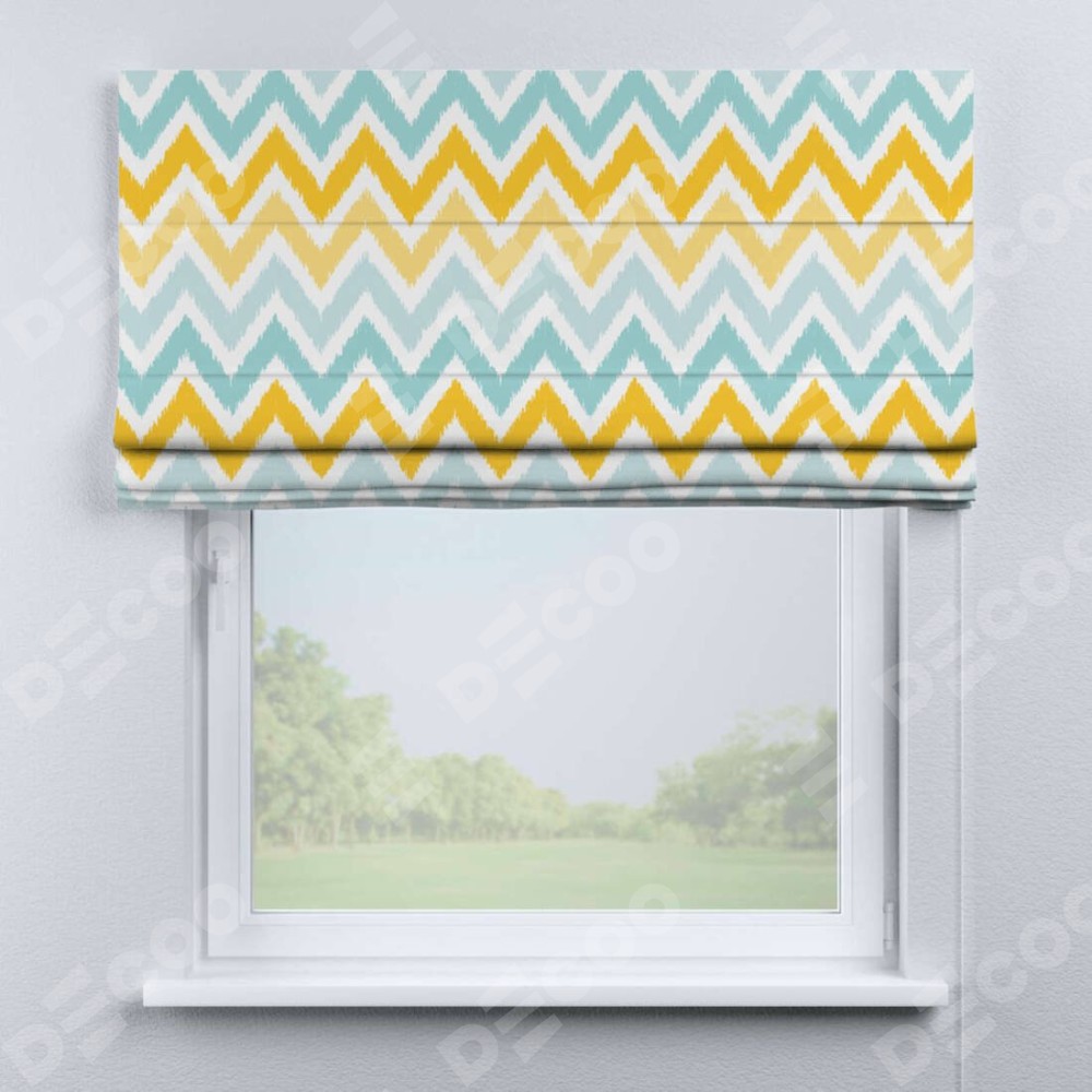 Римская штора производителя «Cortin», используется для проёма, пошита из ткани блэкаут с нанесением сублимационной печати «Икат шеврон». Имеет универсальный механизм и подходит для монтажа: на потолок, на стену и в нишу.
