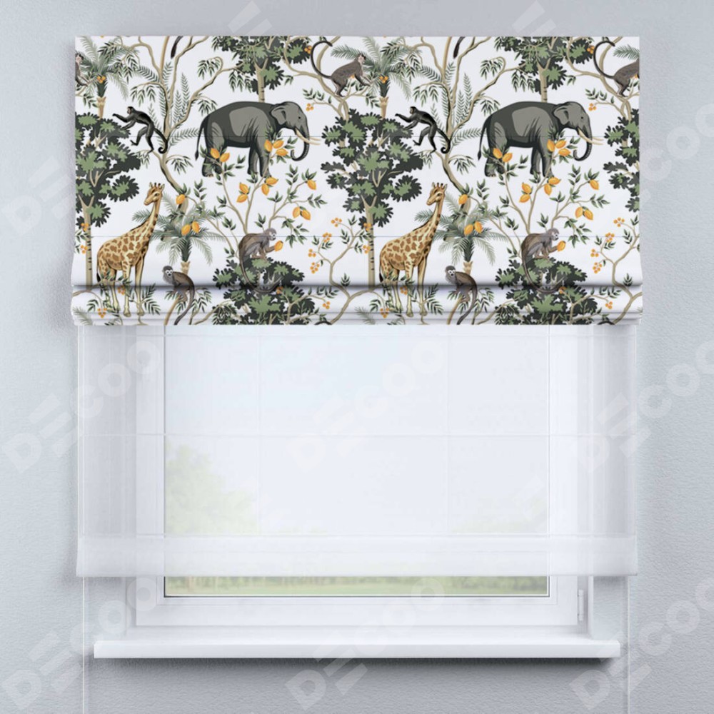 Римская штора день-ночь производителя «Cortin», используется для проёма, пошита из двух полотен, с лицевой блэкаут с нанесением сублимационной печати «Африканские равнины», вторая ткань тюль (по стандарту комплектуется тюль белого цвета артикул V-01). Имеет универсальный механизм и подходит для монтажа: на потолок, на стену и в нишу.
