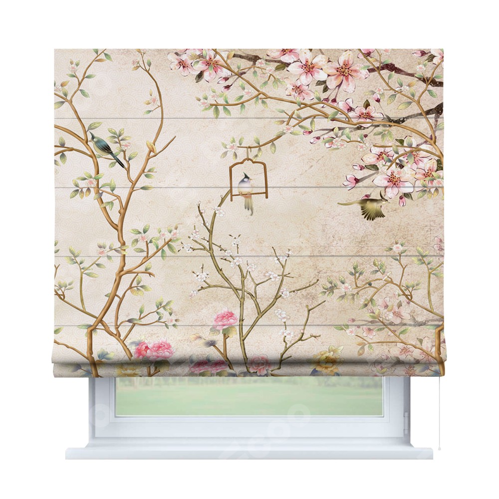 Римская штора производителя «Cortin», используется для проёма, пошита из ткани блэкаут с нанесением сублимационной печати «Весенний сад». Имеет универсальный механизм и подходит для монтажа: на потолок, на стену и в нишу.