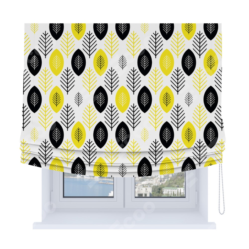 Римская штора Soft производителя «Cortin», используется для проёма, пошита из ткани блэкаут с нанесением сублимационной печати «Черно-желтый модерн». Имеет универсальный механизм и подходит для монтажа: на потолок, на стену и в нишу. В отличие от стандартных римских штор, римская штора Soft не имеет горизонтальных вставок и нижнего отвеса. Это позволяет ткани произвольно драпироваться в свободные мягкие складки.