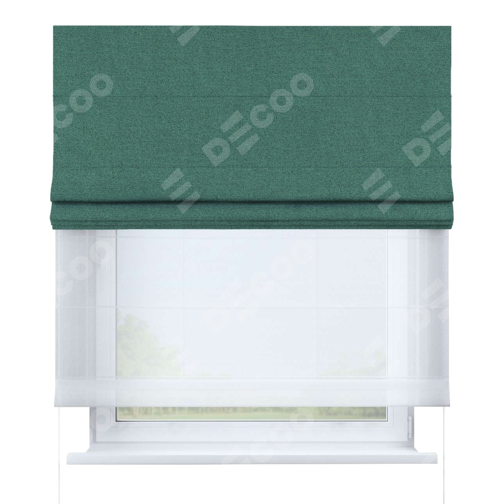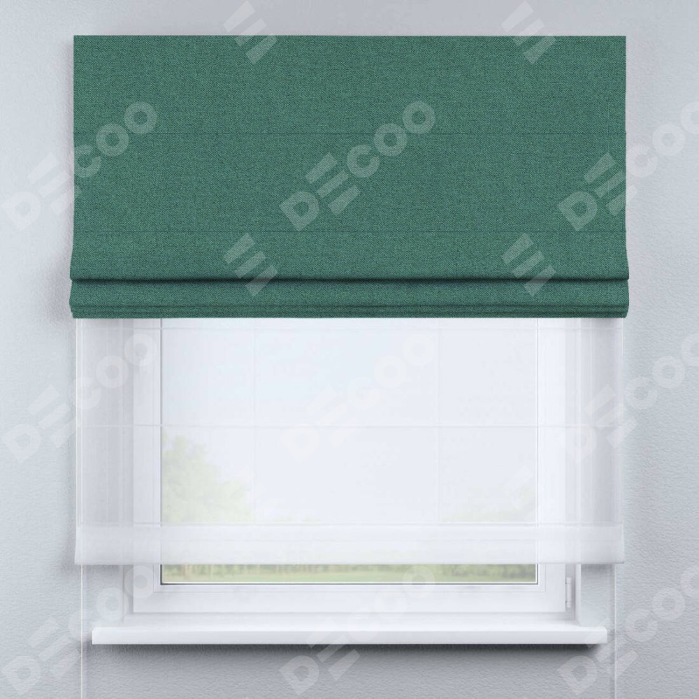 Римская штора день-ночь производителя «Cortin», используется для проёма, пошита из двух полотен, с лицевой стороны лён блэкаут бирюзовый артикул 69517, вторая ткань тюль (по стандарту комплектуется тюль белого цвета артикул V-01). Имеет универсальный механизм и подходит для монтажа: на потолок, на стену и в нишу.