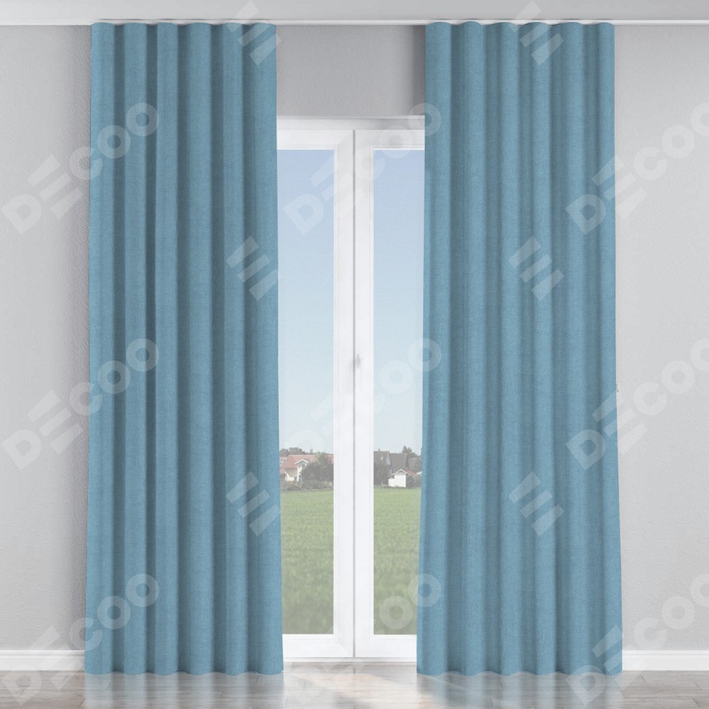 Комплект прямых штор, от производителя «Cortin», пошиты из ткани лён блэкаут голубой, артикул ткани 69574. С изнаночной стороны в верхней части штор пристрачивается шторная лента с декоративными складками «Волна». Для создания элегантных складок прямые шторы шьются по стандарту с коэффициентом 1:2 (на 100 см. ширины проёма 200 см. ширины ткани).