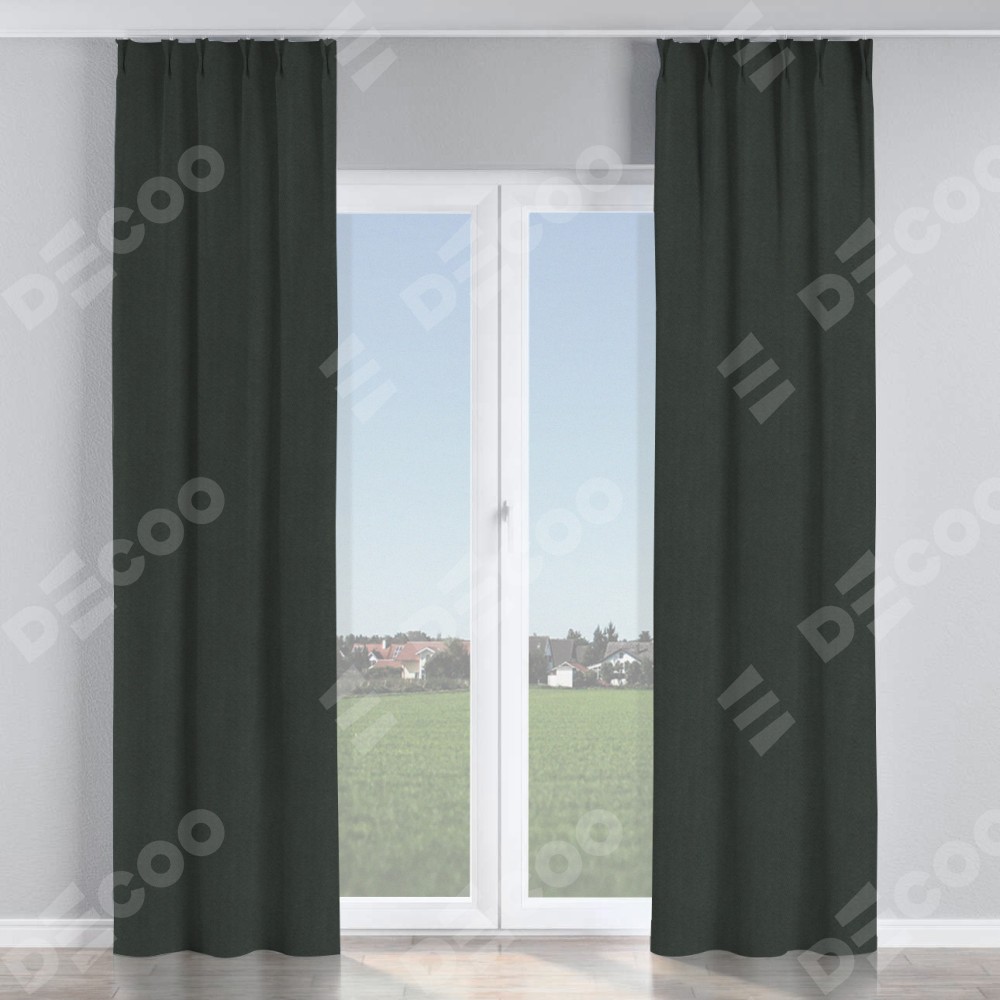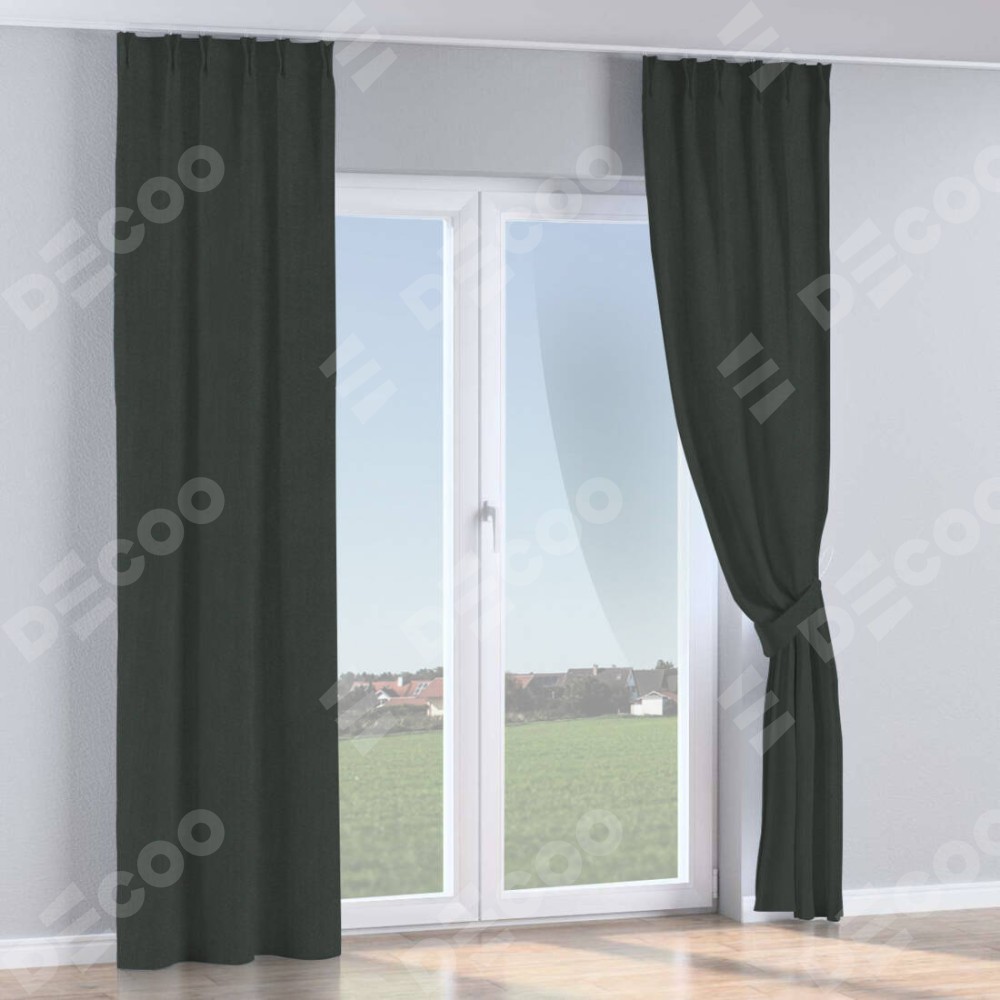 Комплект прямых штор, от производителя «Cortin», пошиты из ткани лён блэкаут графит, артикул ткани 69448. С изнаночной стороны в верхней части штор пристрачивается шторная лента с декоративными складками «Кустик». Для создания элегантных складок прямые шторы шьются по стандарту с коэффициентом 1:2 (на 100 см. ширины проёма 200 см. ширины ткани).