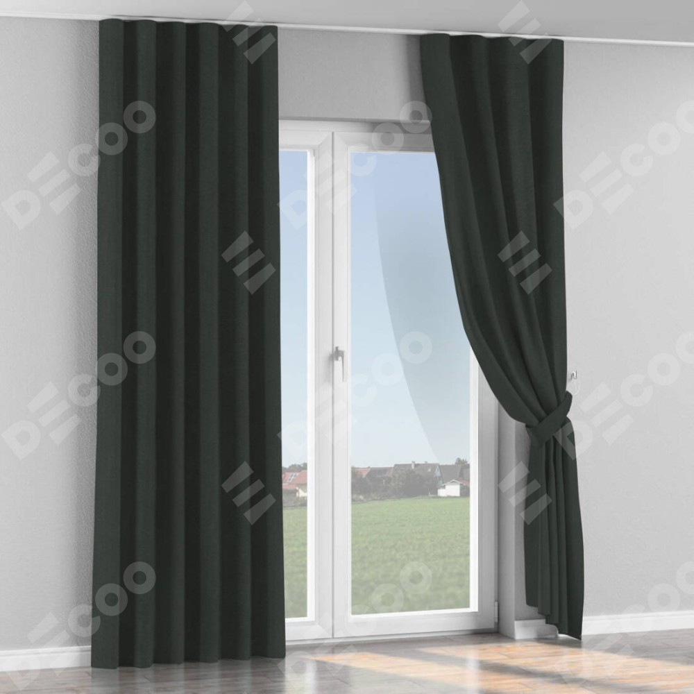 Комплект прямых штор, от производителя «Cortin», пошиты из ткани лён блэкаут графит, артикул ткани 69448. С изнаночной стороны в верхней части штор пристрачивается шторная лента с декоративными складками «Волна». Для создания элегантных складок прямые шторы шьются по стандарту с коэффициентом 1:2 (на 100 см. ширины проёма 200 см. ширины ткани).