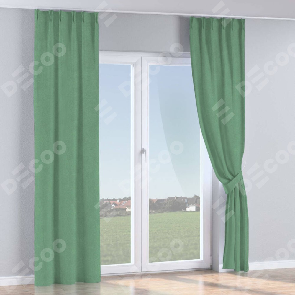 Комплект прямых штор, от производителя «Cortin», пошиты из ткани лён блэкаут светло-бирюзовый, артикул ткани 69443. С изнаночной стороны в верхней части штор пристрачивается шторная лента с декоративными складками «Кустик». Для создания элегантных складок прямые шторы шьются по стандарту с коэффициентом 1:2 (на 100 см. ширины проёма 200 см. ширины ткани).