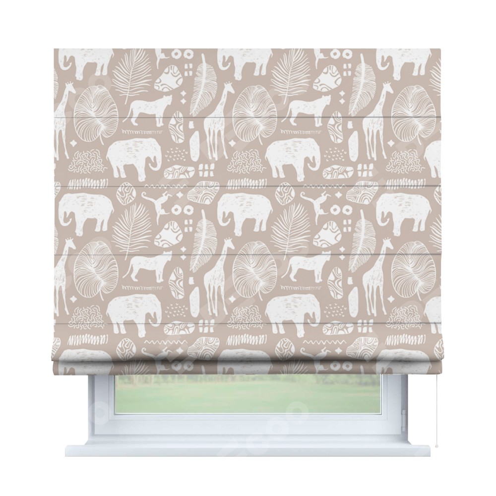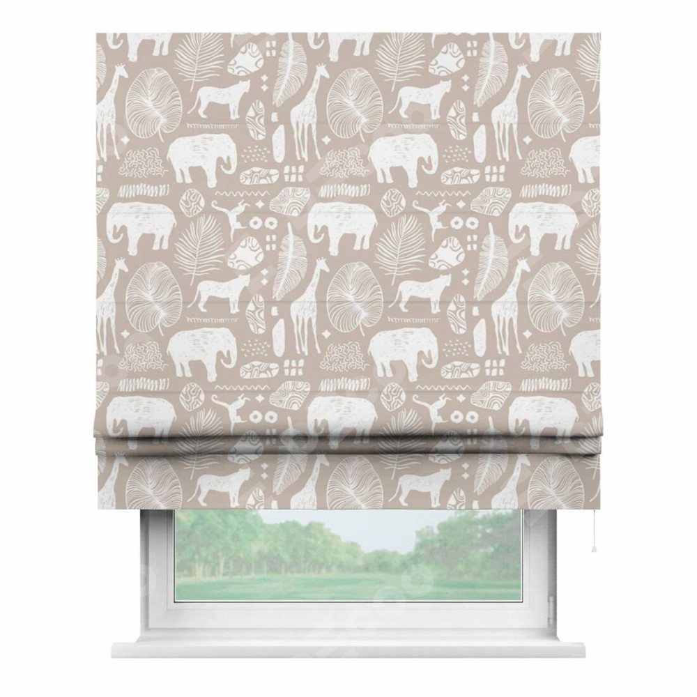 Римская штора производителя «Cortin», используется для проёма, пошита из ткани блэкаут с нанесением сублимационной печати «Африканские животные». Имеет универсальный механизм и подходит для монтажа: на потолок, на стену и в нишу.