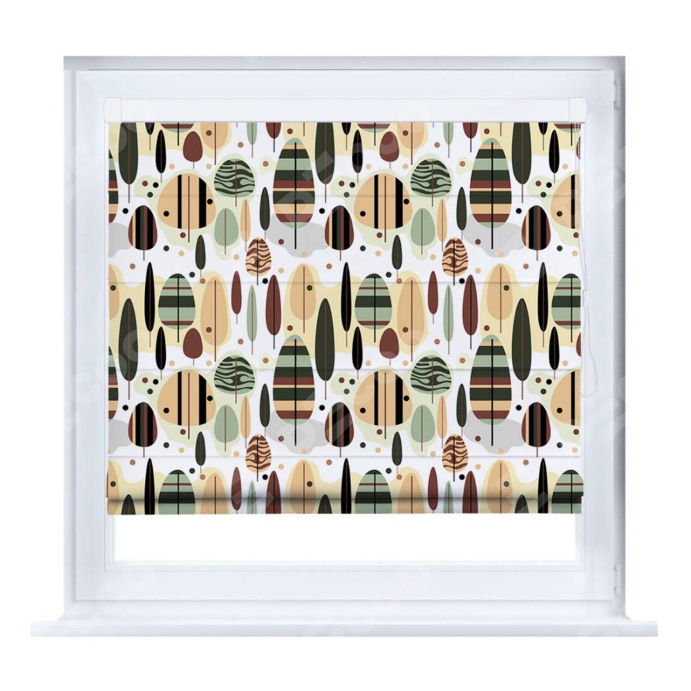 Римская штора производителя «Cortin», устанавливается на створку окна, пошита из ткани блэкаут с нанесением сублимационной печати «Деревья в полоску». Штора шьётся по индивидуальным размерам, для данного типа римской шторы возможная ширина от 35 до 150 см., высота до 250 см.