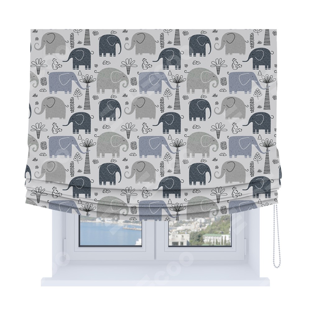 Римская штора Soft производителя «Cortin», используется для проёма, пошита из ткани блэкаут с нанесением сублимационной печати «Серые слоники». Имеет универсальный механизм и подходит для монтажа: на потолок, на стену и в нишу. В отличие от стандартных римских штор, римская штора Soft не имеет горизонтальных вставок и нижнего отвеса. Это позволяет ткани произвольно драпироваться в свободные мягкие складки.