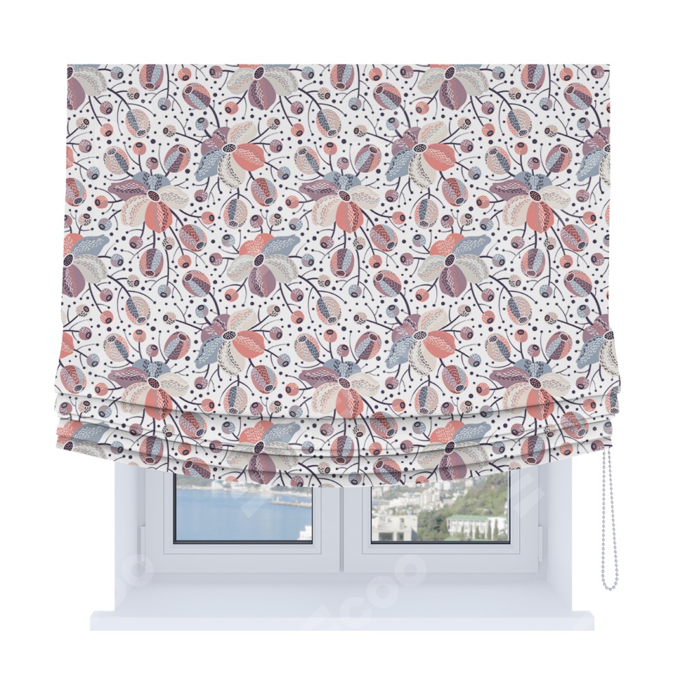 Римская штора Soft производителя «Cortin», используется для проёма, пошита из ткани блэкаут с нанесением сублимационной печати «Цветочный микс». Имеет универсальный механизм и подходит для монтажа: на потолок, на стену и в нишу. В отличие от стандартных римских штор, римская штора Soft не имеет горизонтальных вставок и нижнего отвеса. Это позволяет ткани произвольно драпироваться в свободные мягкие складки.