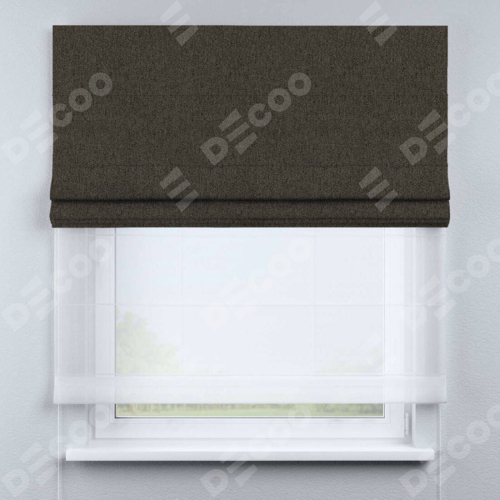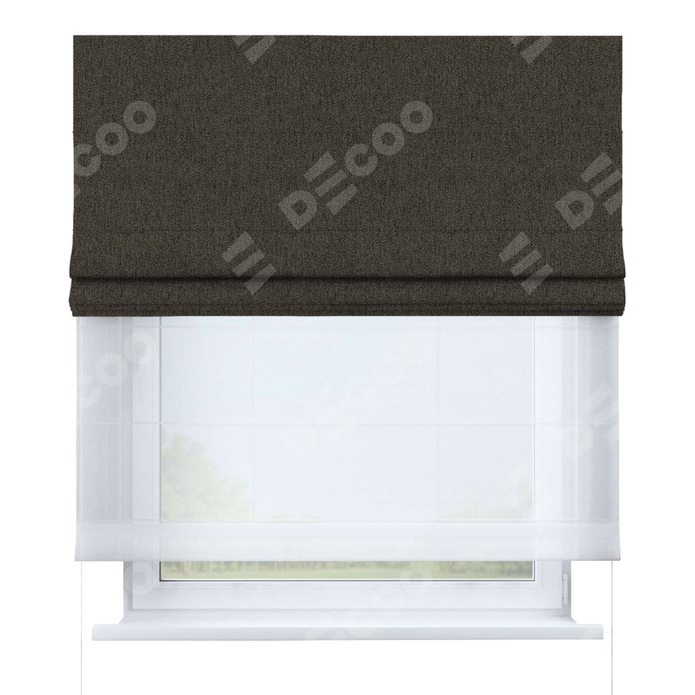 Римская штора день-ночь производителя «Cortin», используется для проёма, пошита из двух полотен, с лицевой стороны твид блэкаут тёмно-коричневый артикул 21584, вторая ткань тюль (по стандарту комплектуется тюль белого цвета артикул V-01). Имеет универсальный механизм и подходит для монтажа: на потолок, на стену и в нишу.