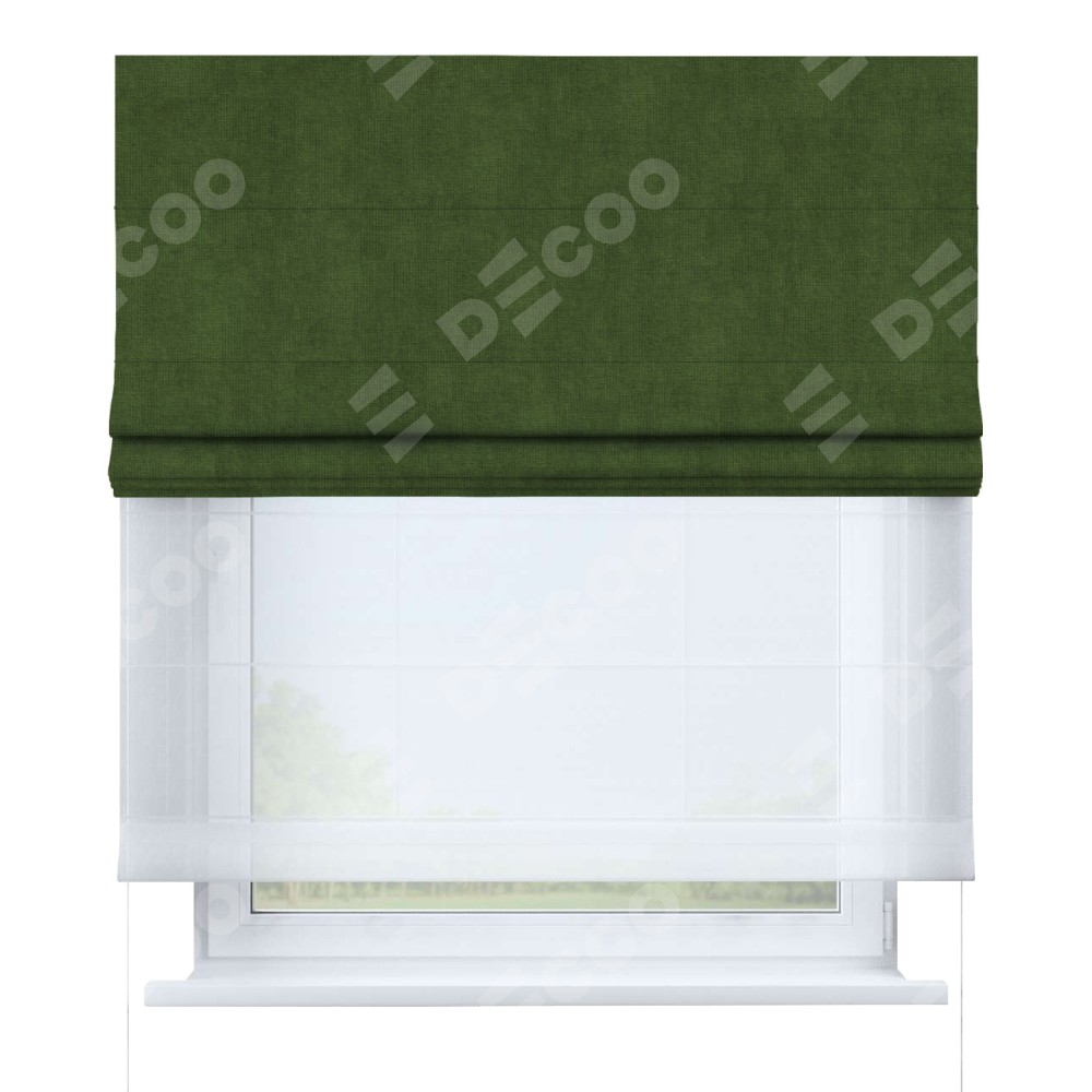 Римская штора день-ночь производителя «Cortin», используется для проёма, пошита из двух полотен, с лицевой стороны вельвет тёмно-салатовый артикул 33805, вторая ткань тюль (по стандарту комплектуется тюль белого цвета артикул V-01). Имеет универсальный механизм и подходит для монтажа: на потолок, на стену и в нишу.