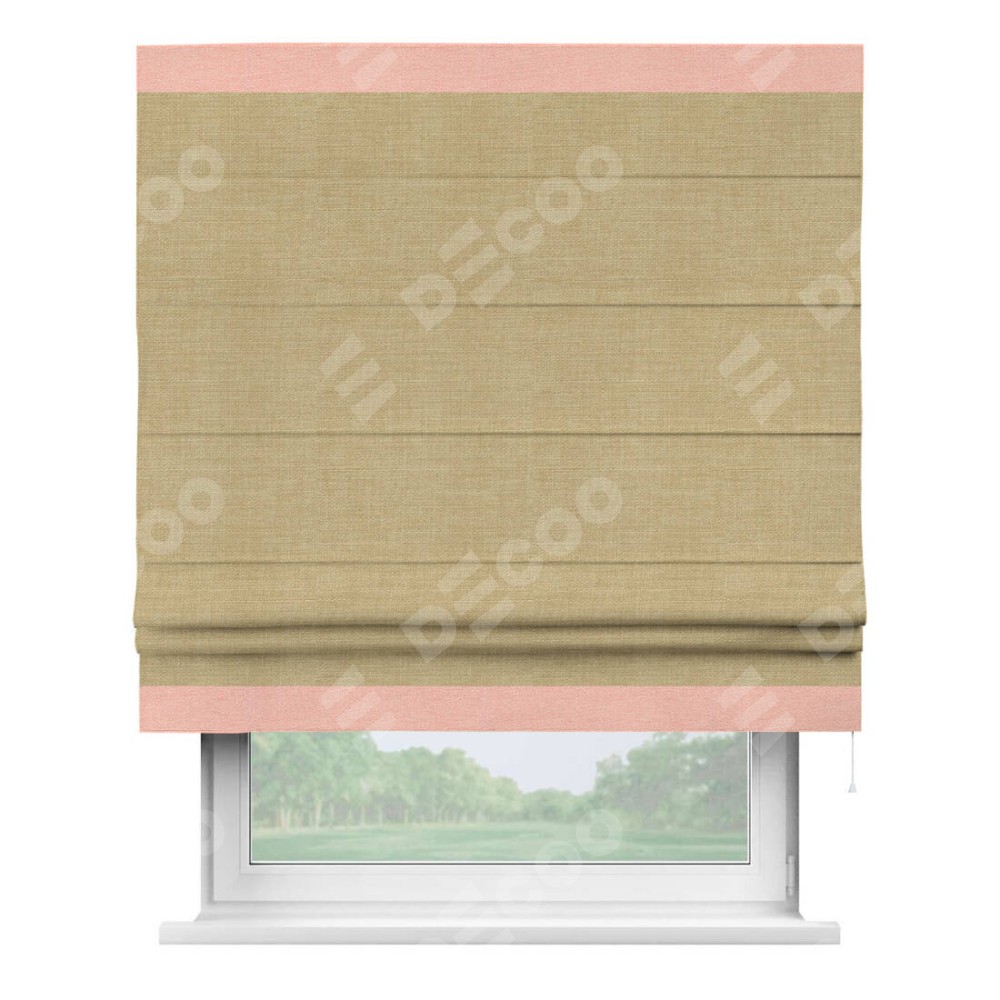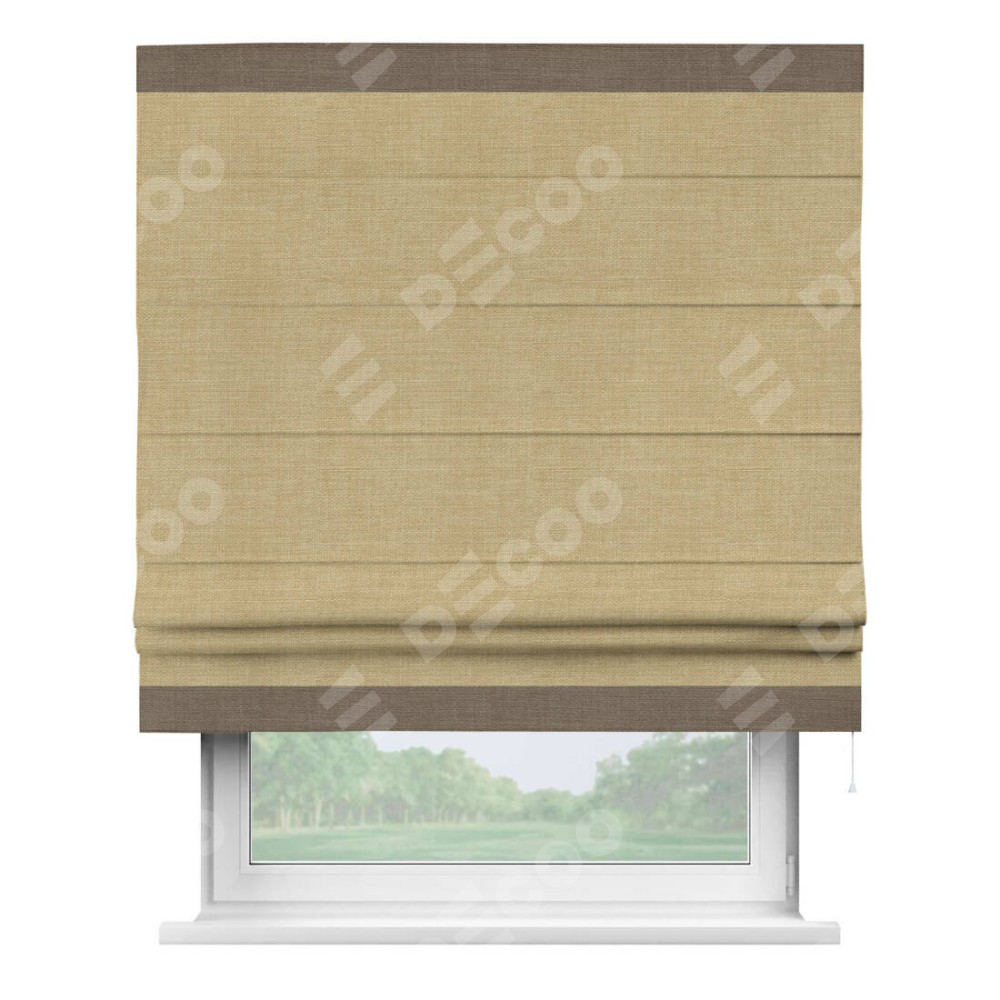 Римская штора производителя «Cortin», используется для проёма, пошита из ткани лён бежевый, артикул 7442. Отделка шторы кантом «Горизонт», ткань для канта используется из льна разной расцветки на выбор. Имеет универсальный механизм и подходит для монтажа: на потолок, на стену и в нишу.