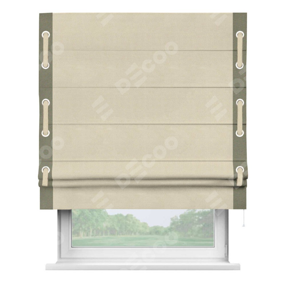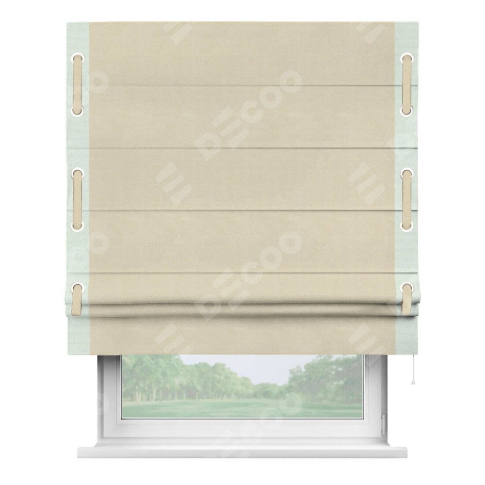 Римская штора производителя «Cortin», используется для проёма, пошита из ткани блэкаут однотонный бежевый, артикул ткани 13125. Отделка шторы кантом «Стрим Дуо» на кантах расположены люверсы с пояском, ткань для канта используется из блэкаута однотонного разной расцветки на выбор. Ткань для пояска обычно используется из основной ткани шторы, а так же можно сделать из любой расцветки по желанию. Имеет универсальный механизм и подходит для монтажа: на потолок, на стену и в нишу.