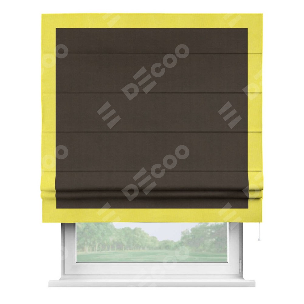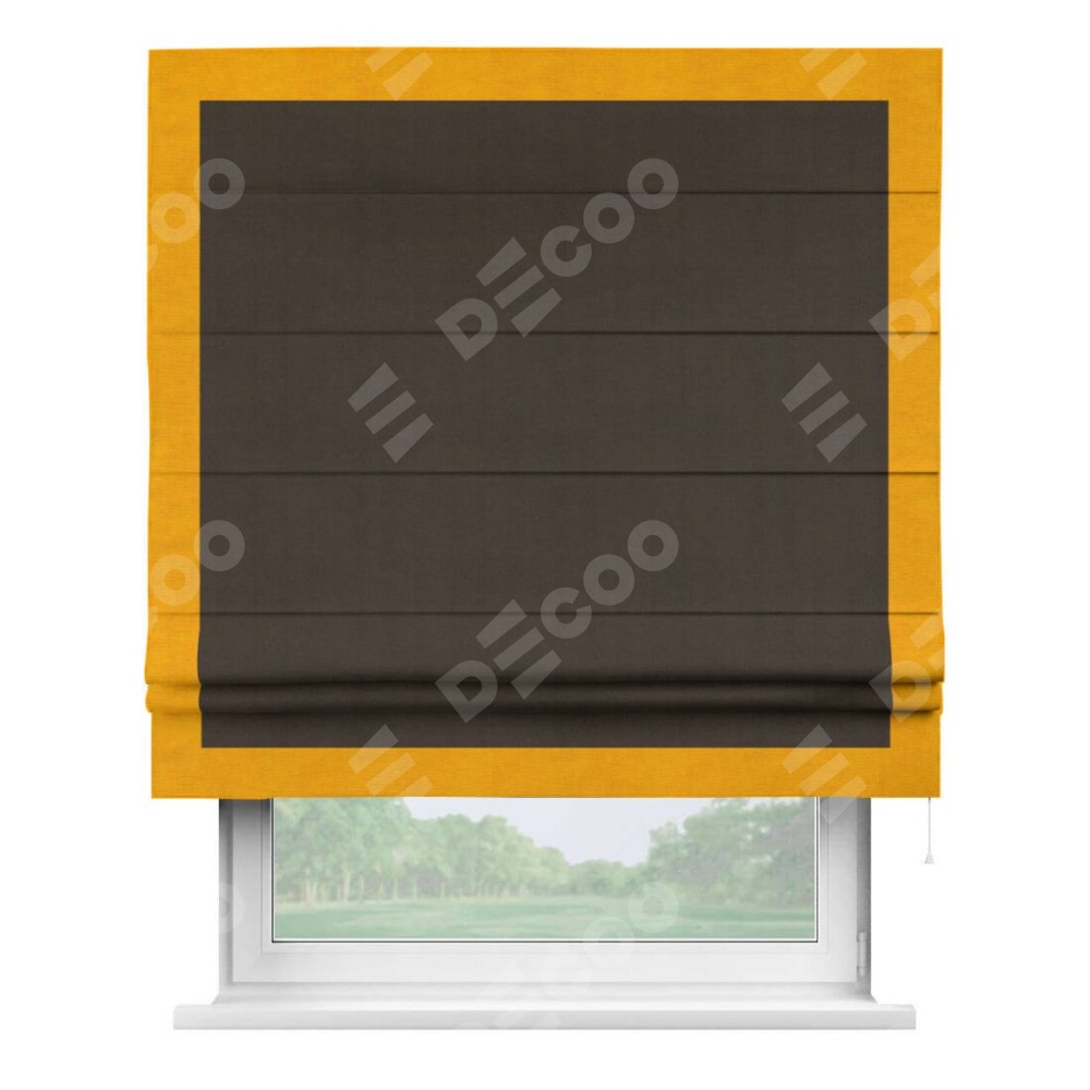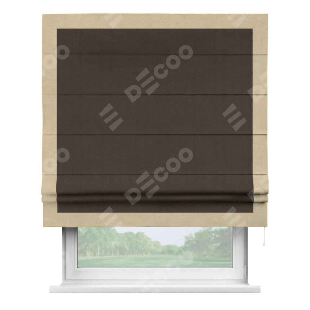 Римская штора производителя «Cortin», используется для проёма, пошита из ткани вельвет тёмно-коричневый, артикул ткани 30991. Отделка шторы кантом «Чесс», ткань для канта используется из вельвета разной расцветки на выбор. Имеет универсальный механизм и подходит для монтажа: на потолок, на стену и в нишу.