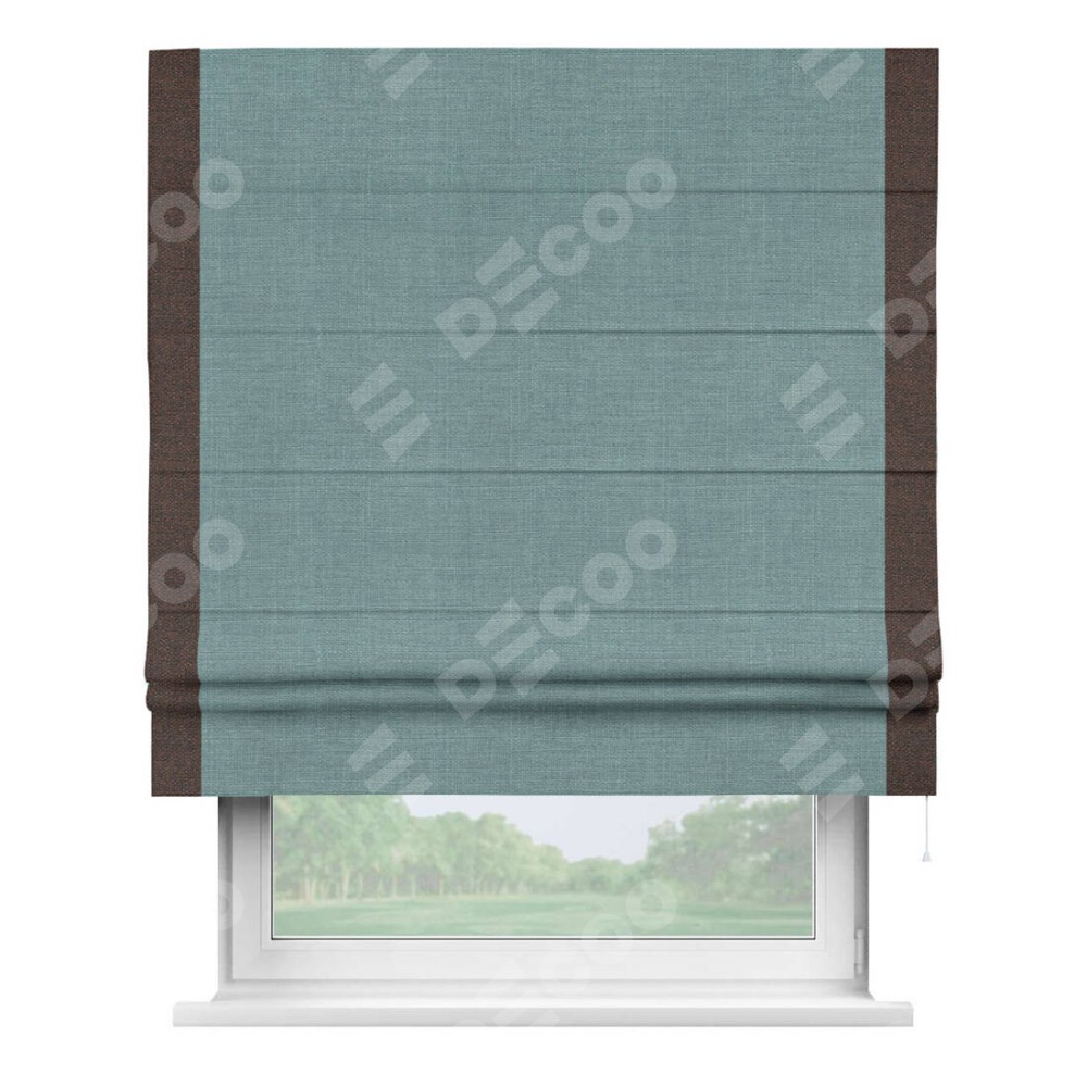 Римская штора производителя «Cortin», используется для проёма, пошита из ткани лён голубой, артикул 74736. Отделка шторы кантом «Стрим Дуо», ткань для канта используется из льна разной расцветки на выбор. Имеет универсальный механизм и подходит для монтажа: на потолок, на стену и в нишу.