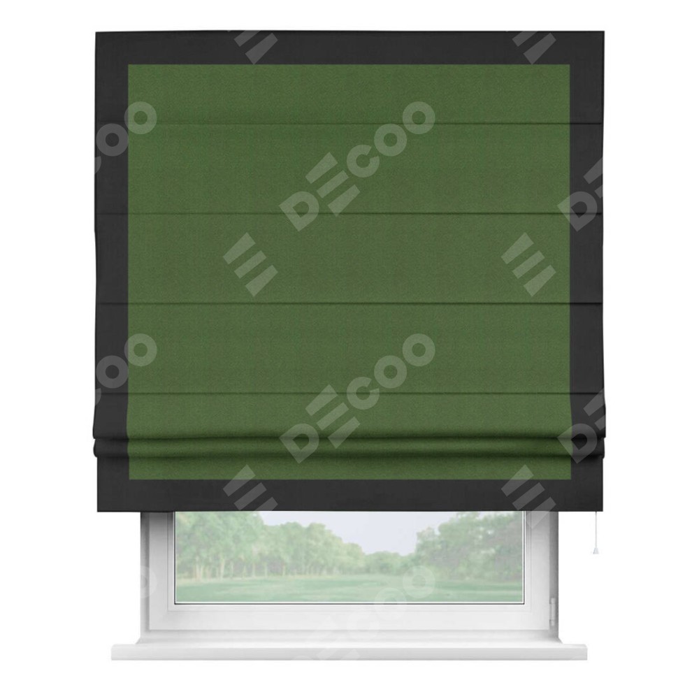 Римская штора производителя «Cortin», используется для проёма, пошита из ткани блэкаут однотонный зелёный перламутр, артикул ткани 81859−2. Отделка шторы кантом «Чесс», ткань для канта используется из блэкаута однотонного разной расцветки на выбор. Имеет универсальный механизм и подходит для монтажа: на потолок, на стену и в нишу.