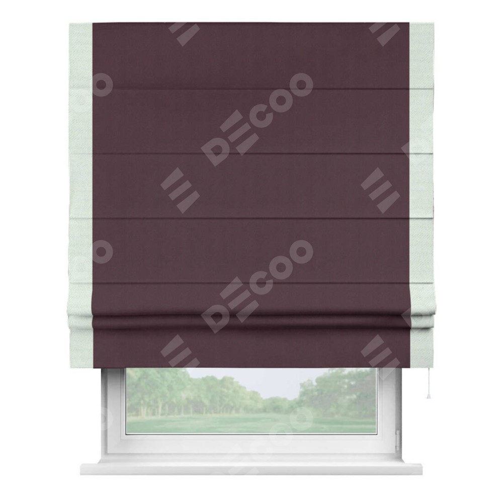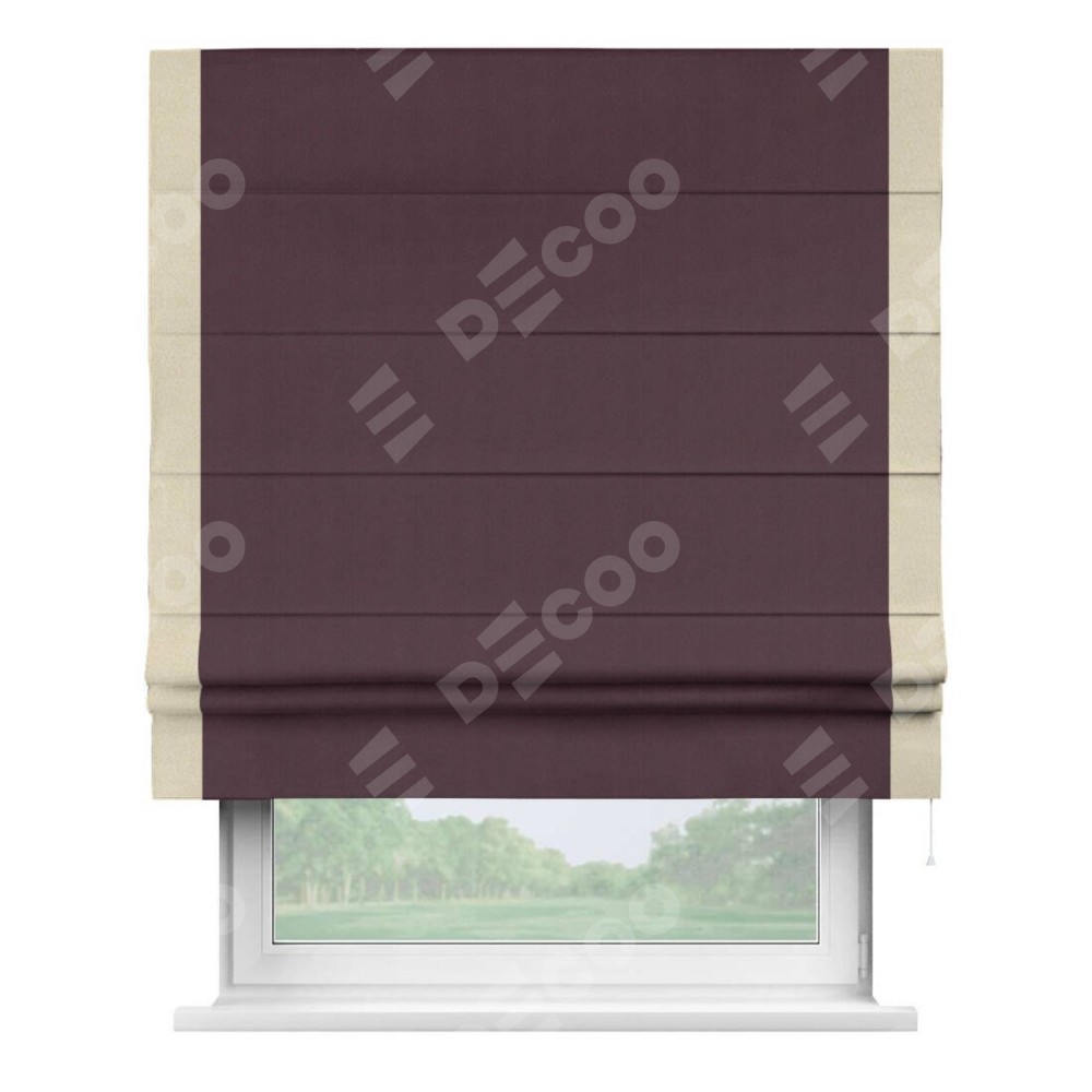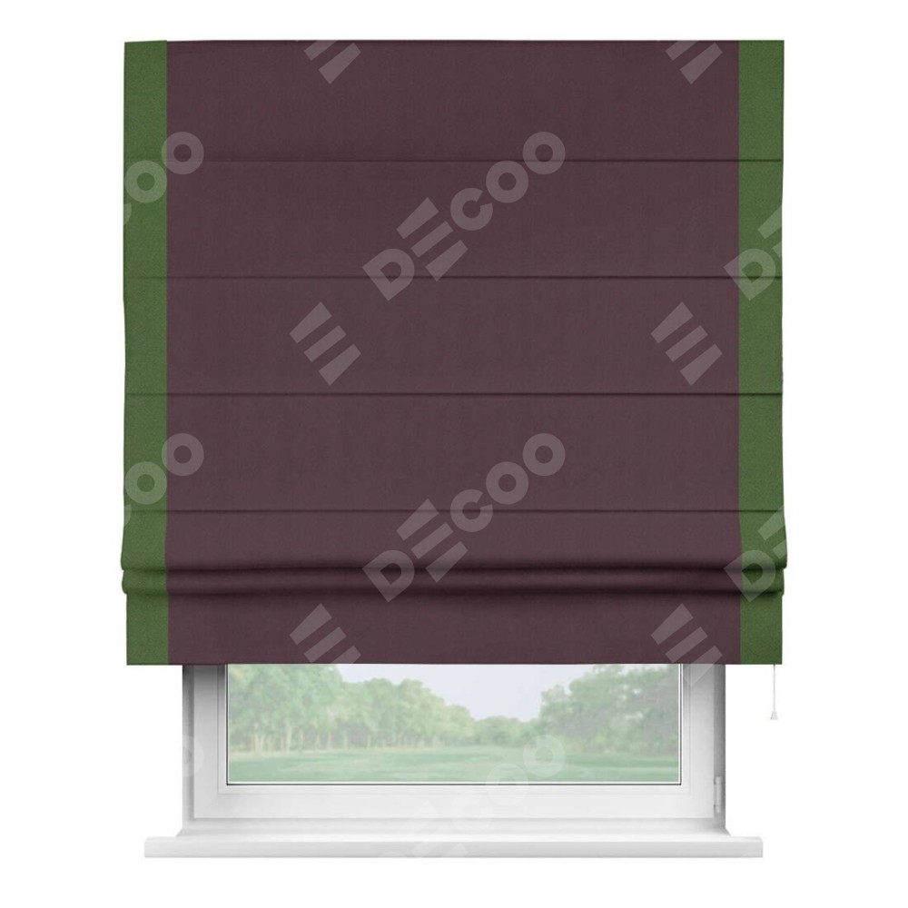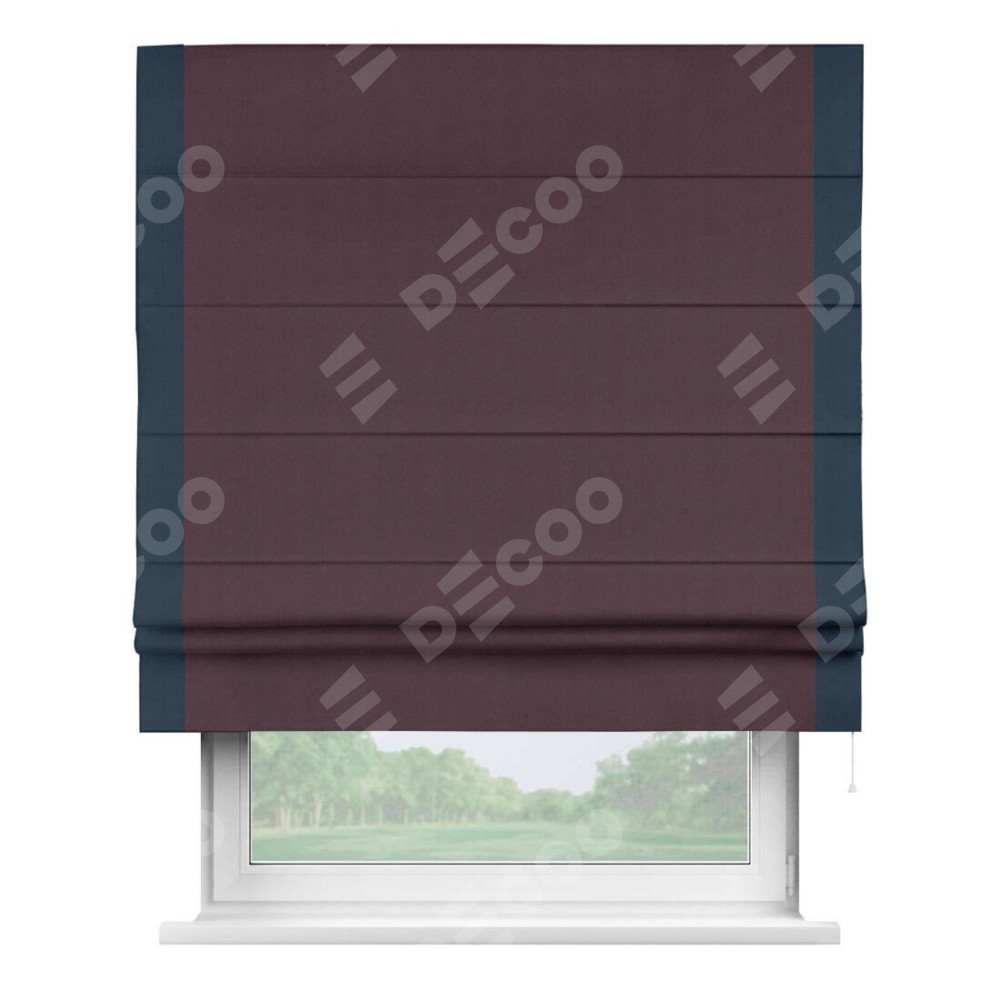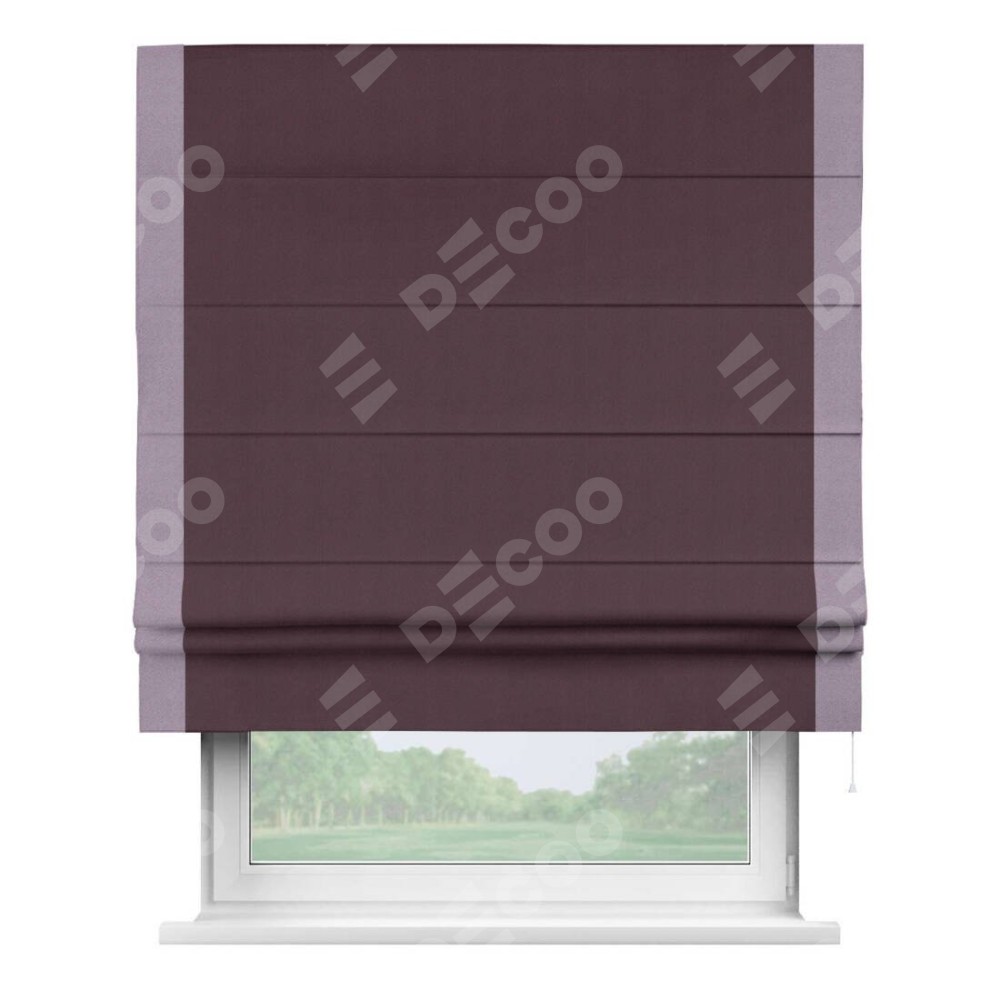 Римская штора производителя «Cortin», используется для проёма, пошита из ткани блэкаут однотонный сиреневый, артикул ткани 29333−2. Отделка шторы кантом «Стрим Дуо», ткань для канта используется из блэкаута однотонного разной расцветки на выбор. Имеет универсальный механизм и подходит для монтажа: на потолок, на стену и в нишу.