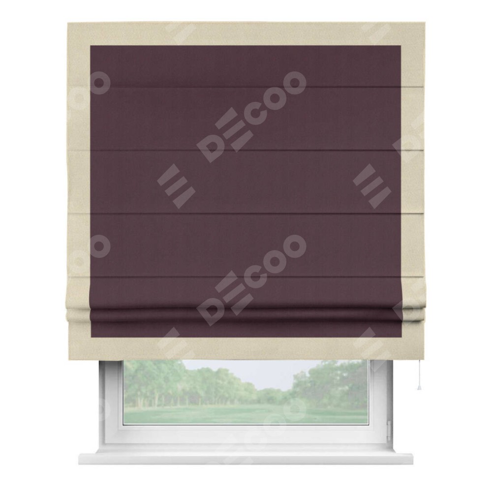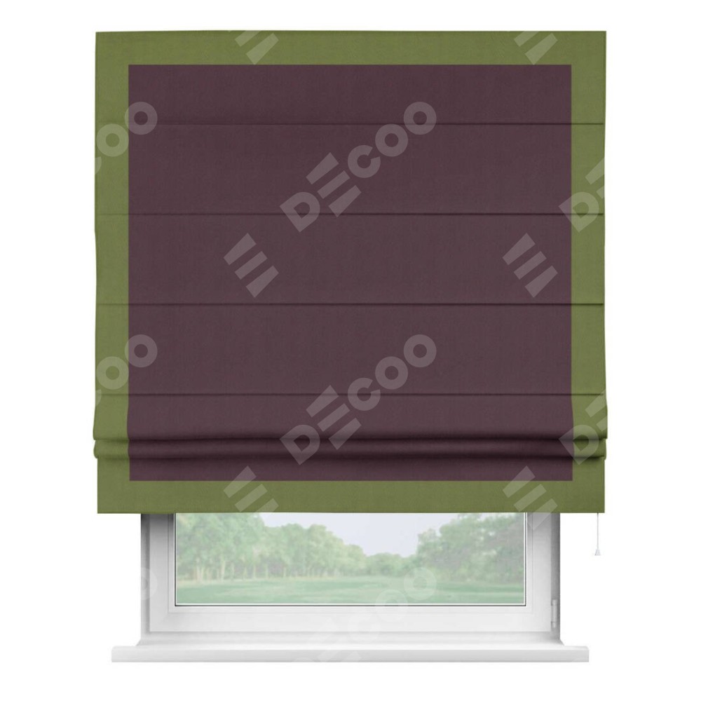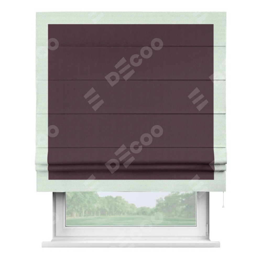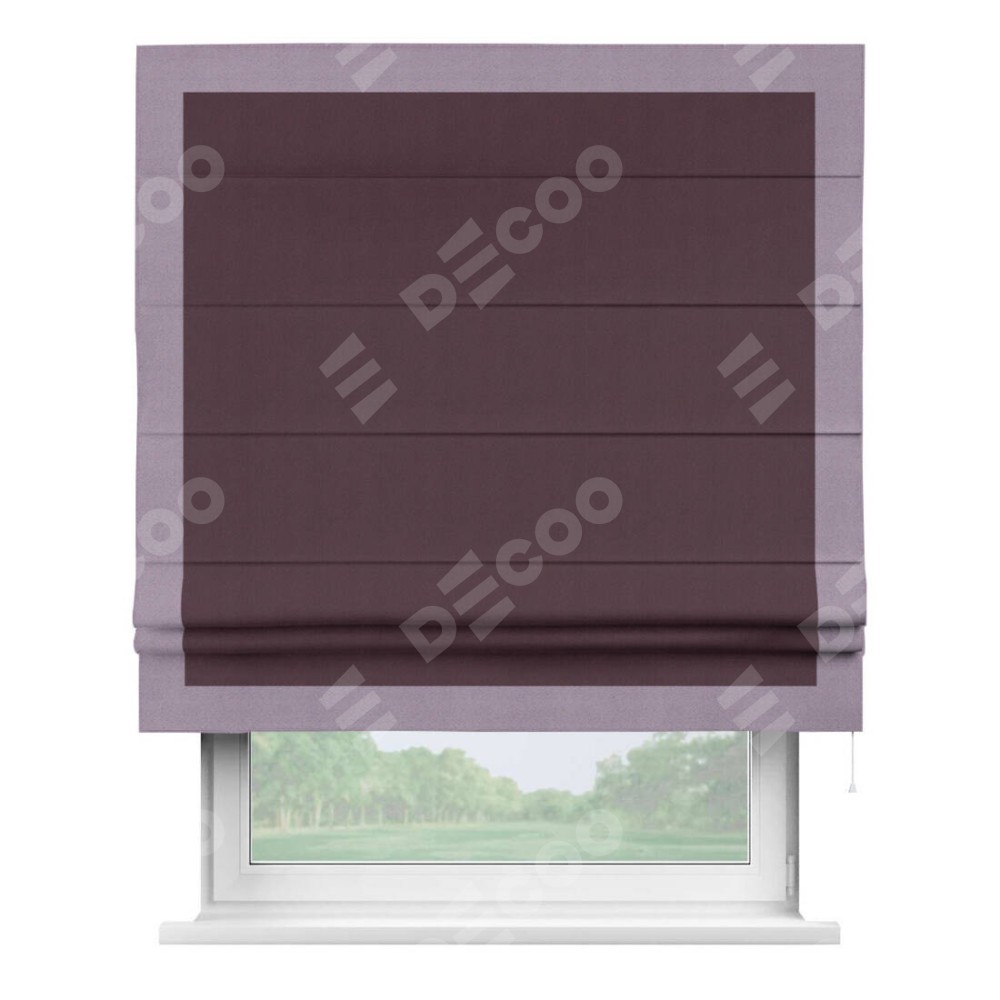 Римская штора производителя «Cortin», используется для проёма, пошита из ткани блэкаут однотонный сиреневый, артикул ткани 29333−2. Отделка шторы кантом «Чесс», ткань для канта используется из блэкаута однотонного разной расцветки на выбор. Имеет универсальный механизм и подходит для монтажа: на потолок, на стену и в нишу.