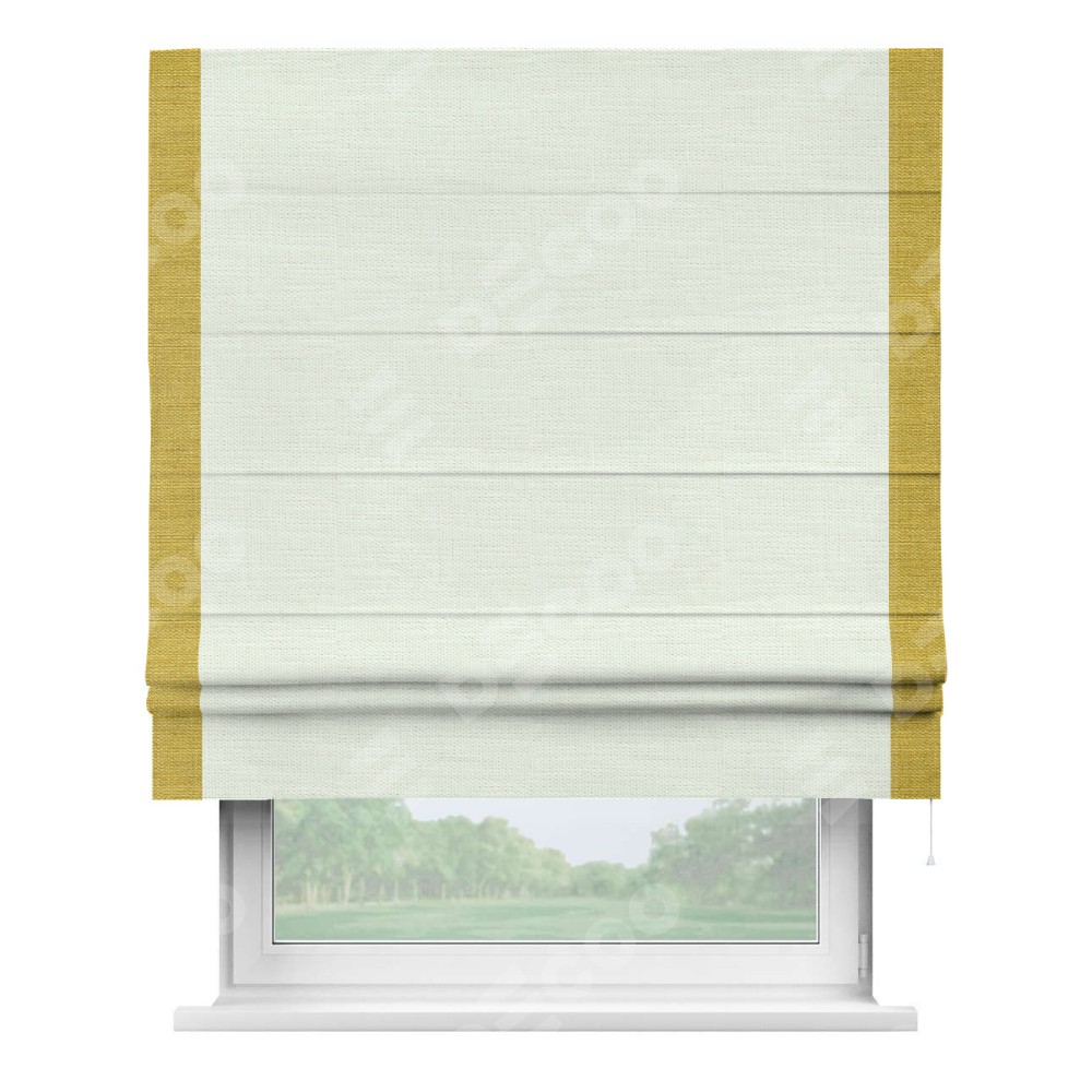 Римская штора производителя «Cortin», используется для проёма, пошита из ткани лён молочный, артикул 23568. Отделка шторы кантом «Стрим Дуо», ткань для канта используется из льна разной расцветки на выбор. Имеет универсальный механизм и подходит для монтажа: на потолок, на стену и в нишу.