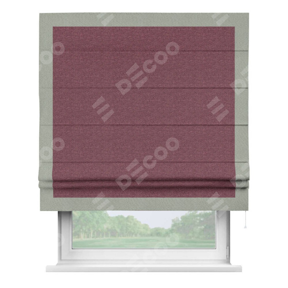 Римская штора производителя «Cortin», используется для проёма, пошита из ткани лён димаут марсала, артикул 1602. Отделка шторы кантом «Чесс», ткань для канта используется из льна димаут разной расцветки на выбор. Имеет универсальный механизм и подходит для монтажа: на потолок, на стену и в нишу.