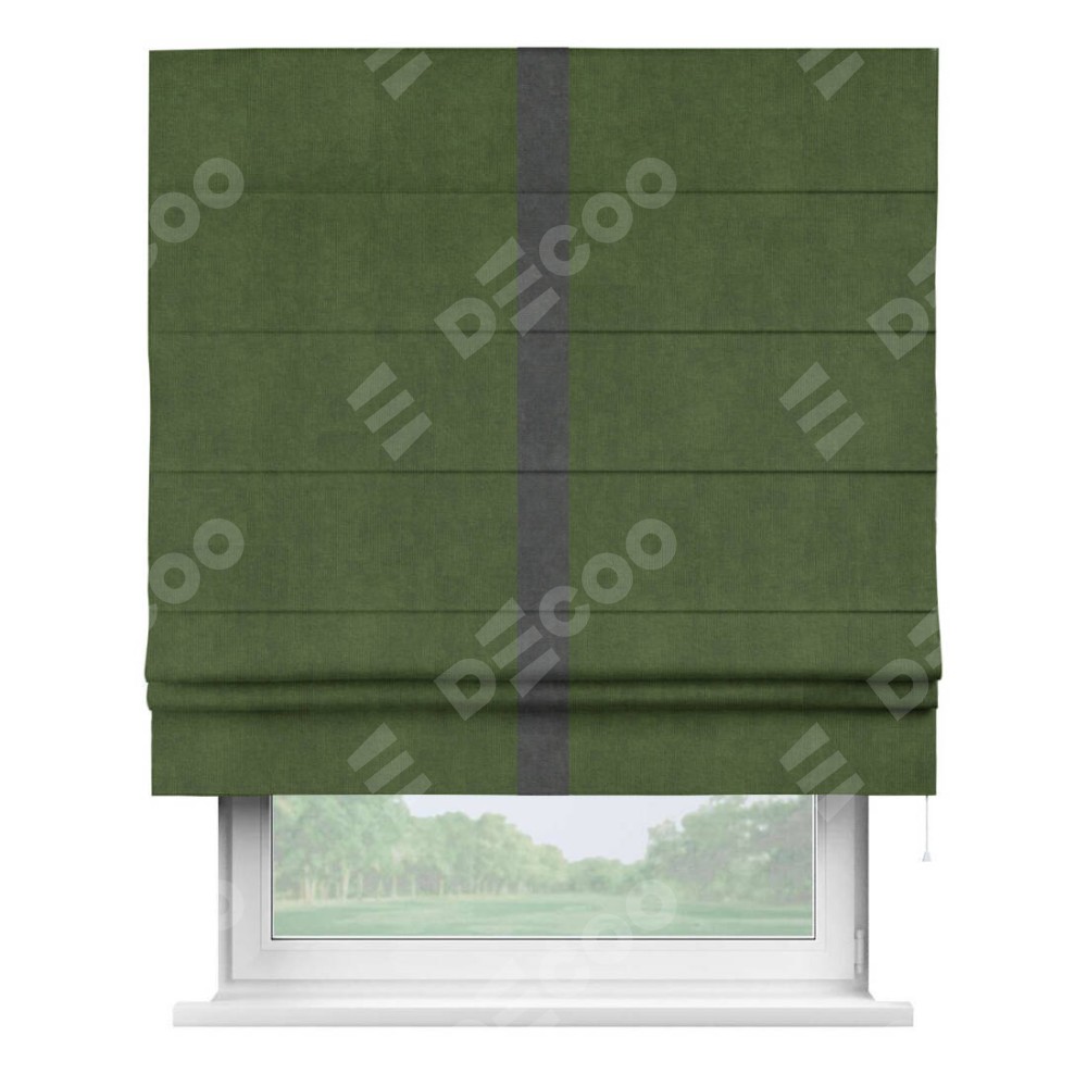 Римская штора производителя «Cortin», используется для проёма, пошита из ткани вельвет тёмно-салатовый, артикул ткани 33805. Отделка шторы кантом «Хайвей», ткань для канта используется из вельвета разной расцветки на выбор. Имеет универсальный механизм и подходит для монтажа: на потолок, на стену и в нишу.