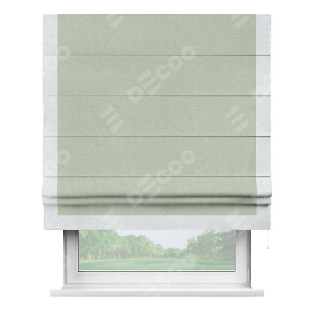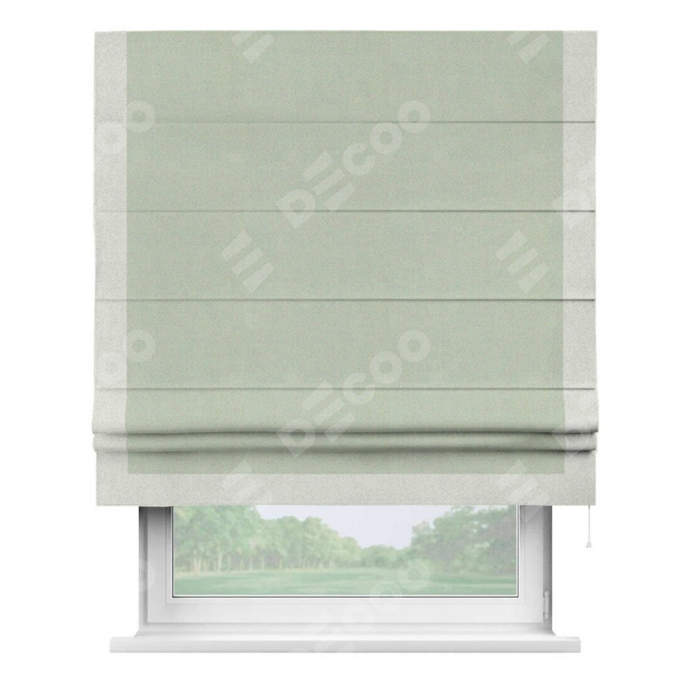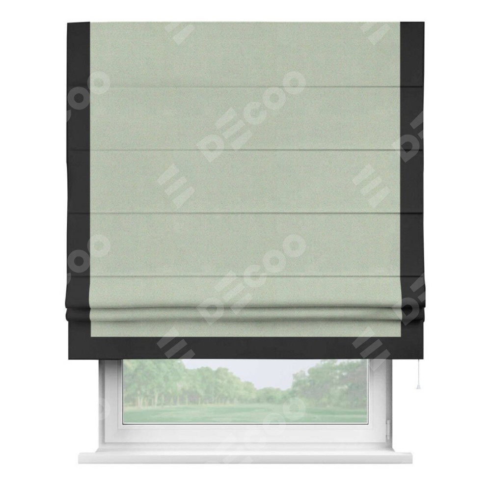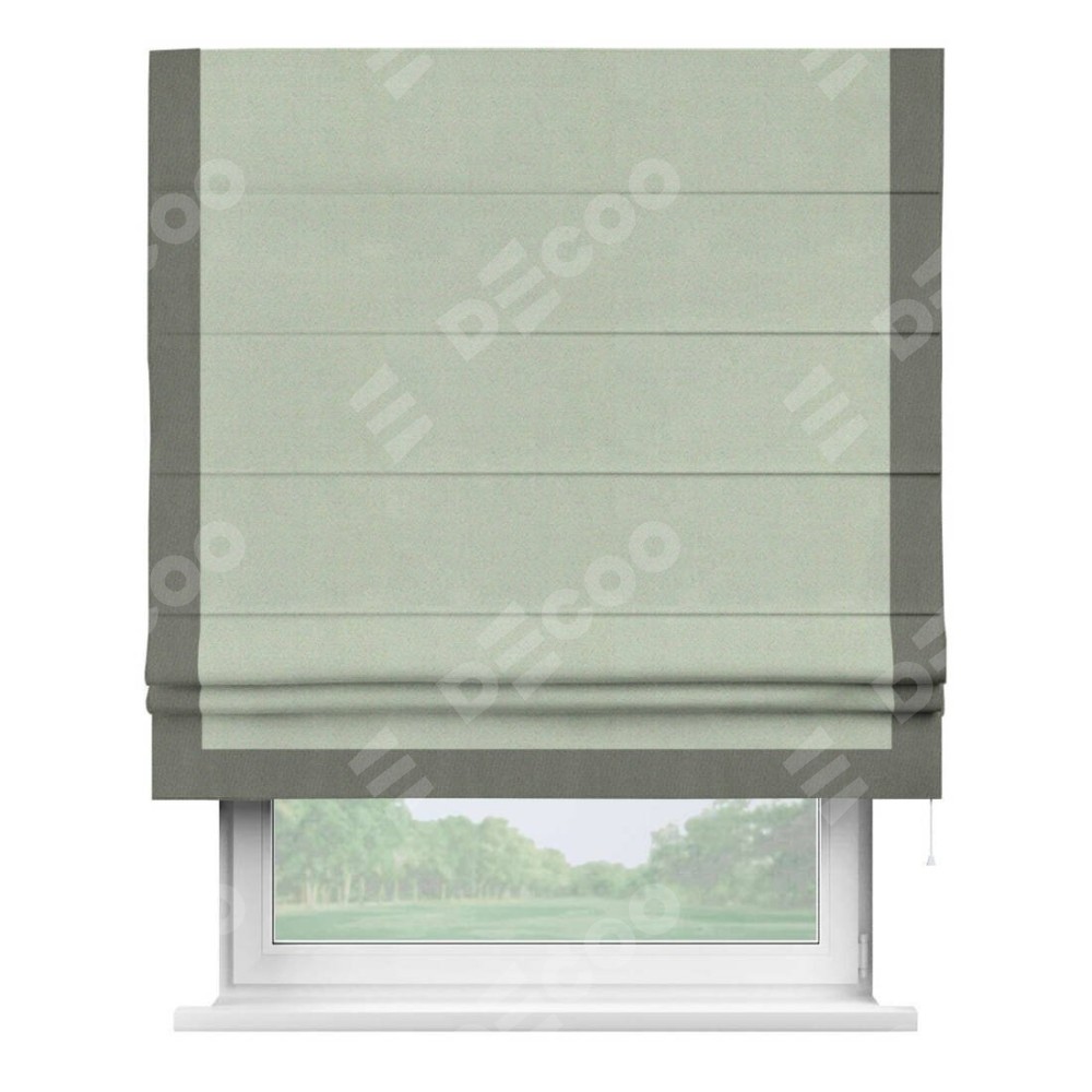 Римская штора производителя «Cortin», используется для проёма, пошита из ткани блэкаут однотонный светло-серый, артикул ткани 29332−2. Отделка шторы кантом «Виктория», ткань для канта используется из блэкаута однотонного разной расцветки на выбор. Имеет универсальный механизм и подходит для монтажа: на потолок, на стену и в нишу.