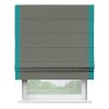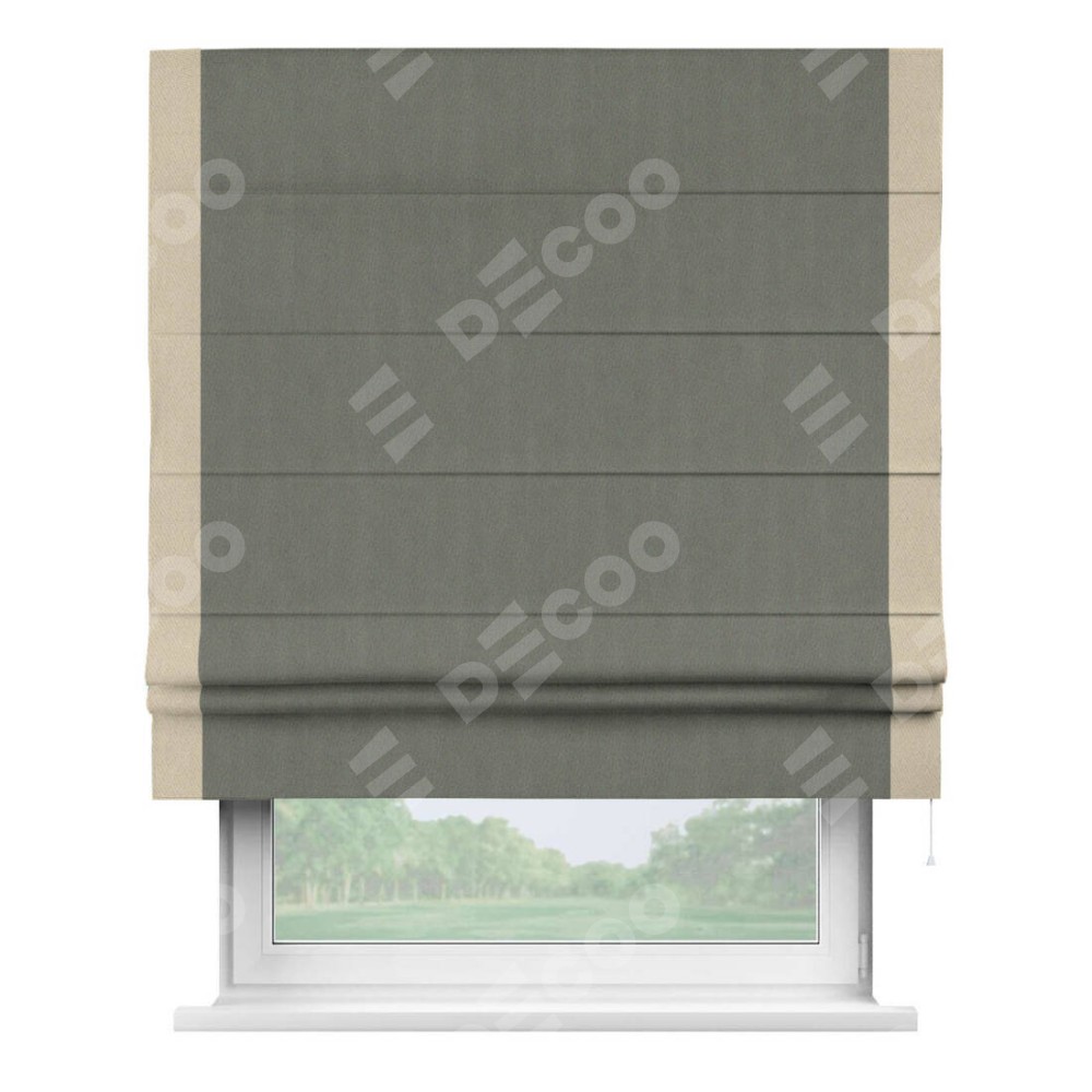 Римская штора производителя «Cortin», используется для проёма, пошита из ткани блэкаут однотонный тёмно-серый, артикул ткани 29332−1. Отделка шторы кантом «Стрим Дуо», ткань для канта используется из блэкаута однотонного разной расцветки на выбор. Имеет универсальный механизм и подходит для монтажа: на потолок, на стену и в нишу.