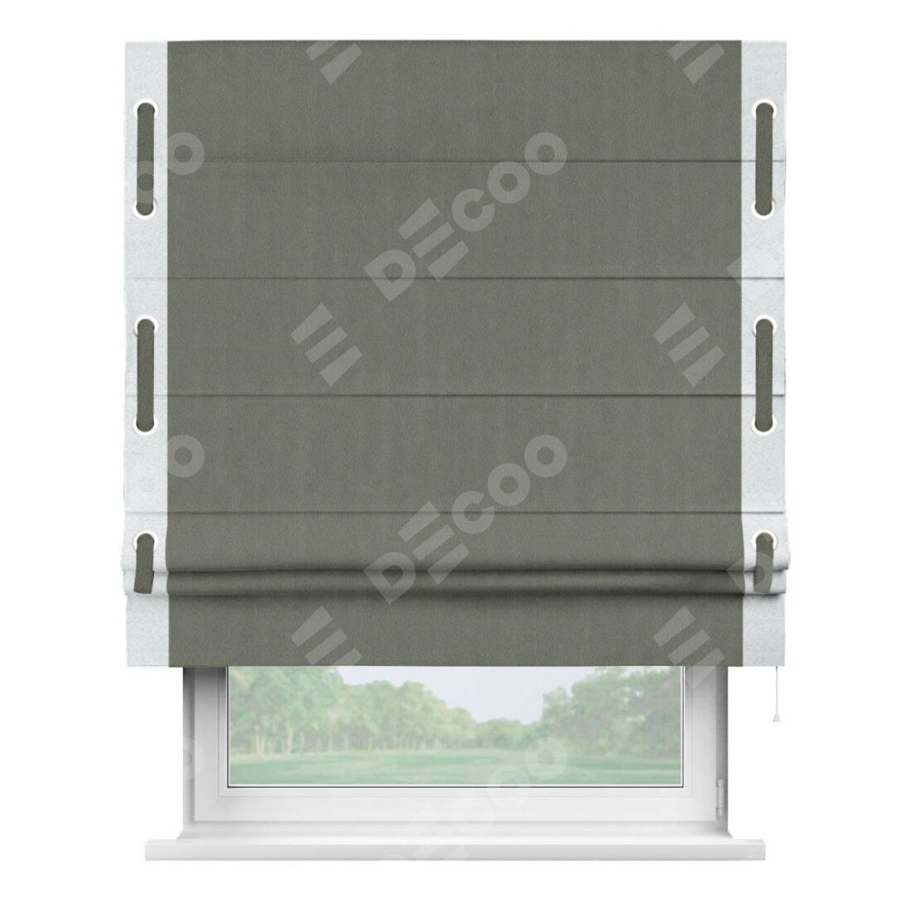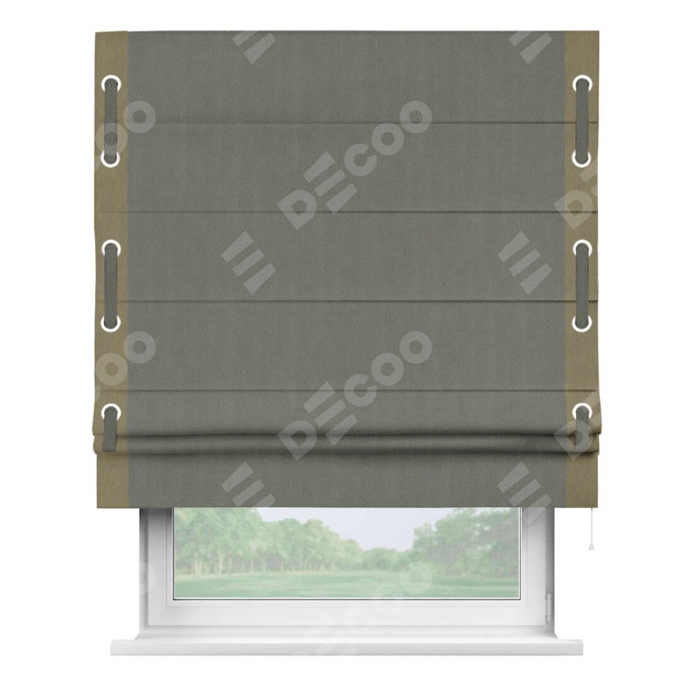 Римская штора производителя «Cortin», используется для проёма, пошита из ткани блэкаут однотонный тёмно-серый, артикул ткани 29332−1. Отделка шторы кантом «Стрим Дуо» на кантах расположены люверсы с пояском, ткань для канта используется из блэкаута однотонного разной расцветки на выбор. Ткань для пояска обычно используется из основной ткани шторы, а так же можно сделать из любой расцветки по желанию. Имеет универсальный механизм и подходит для монтажа: на потолок, на стену и в нишу.