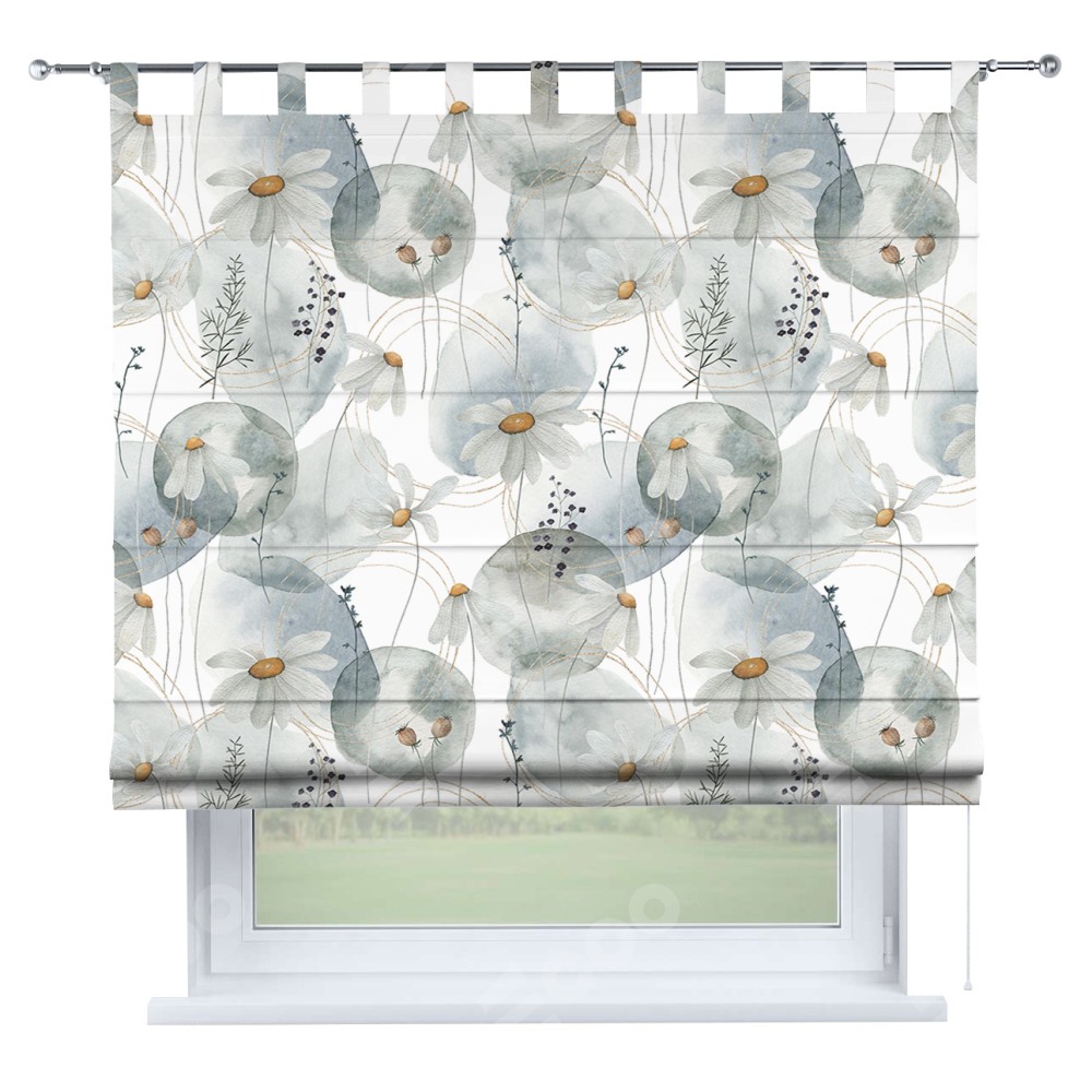 Римская штора производителя «Cortin», используется для проёма, пошита из ткани блэкаут с нанесением сублимационной печати «Ромашки акварель». Данная модель пошита на петлях, комплектуется на выбор круглым карнизом и подходит для монтажа на стену. Римская штора на петлях имеет простую систему регулировки высоты, отличительным преимуществом данной модели является простой способ монтажа. Достаточно повесить ее на трубу и штора готова!