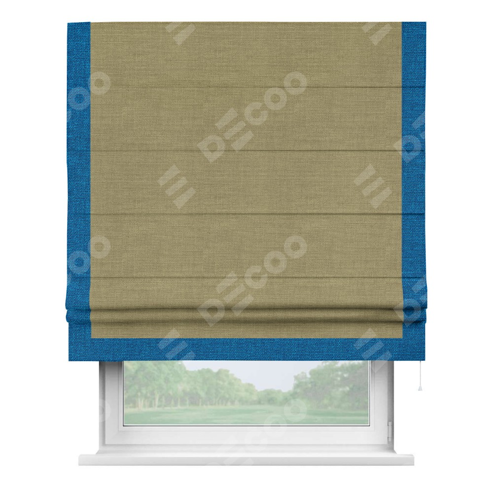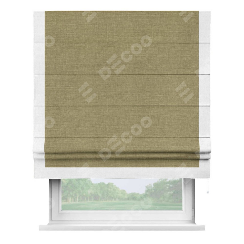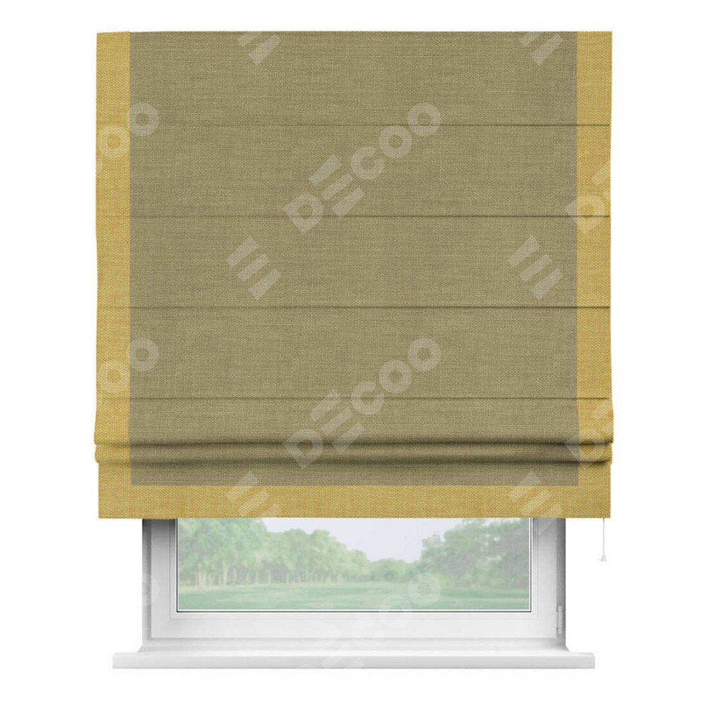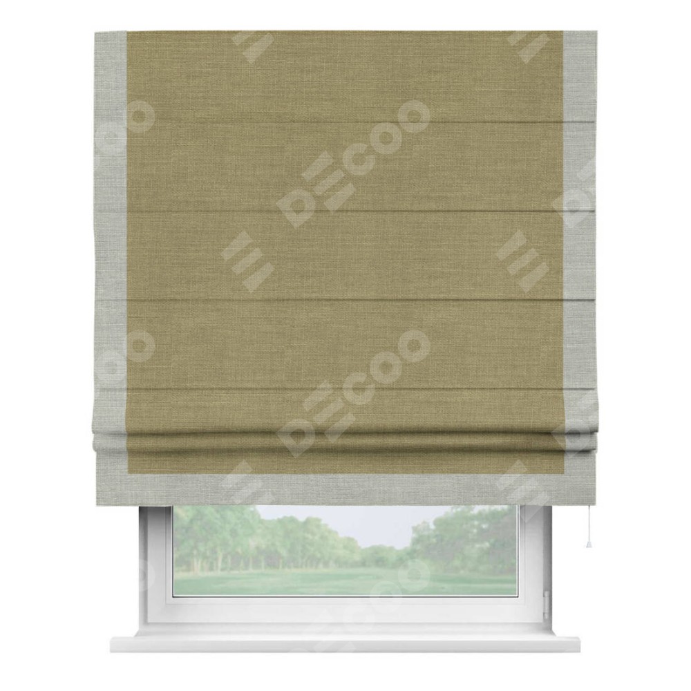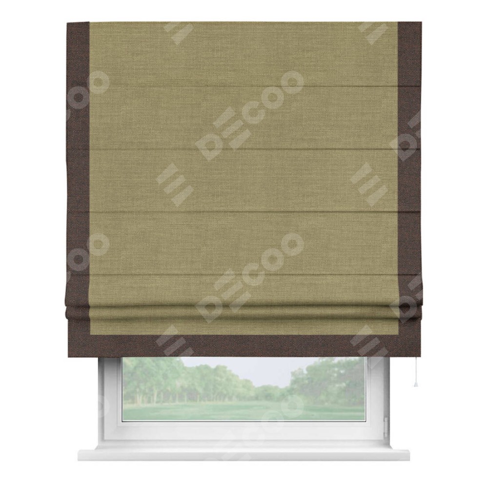 Римская штора производителя «Cortin», используется для проёма, пошита из ткани лён коричневый, артикул 7443. Отделка шторы кантом «Виктория», ткань для канта используется из льна разной расцветки на выбор. Имеет универсальный механизм и подходит для монтажа: на потолок, на стену и в нишу.