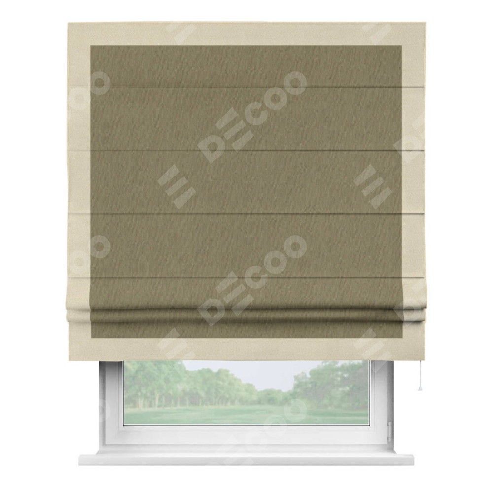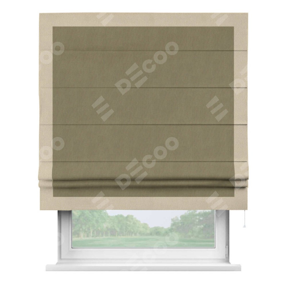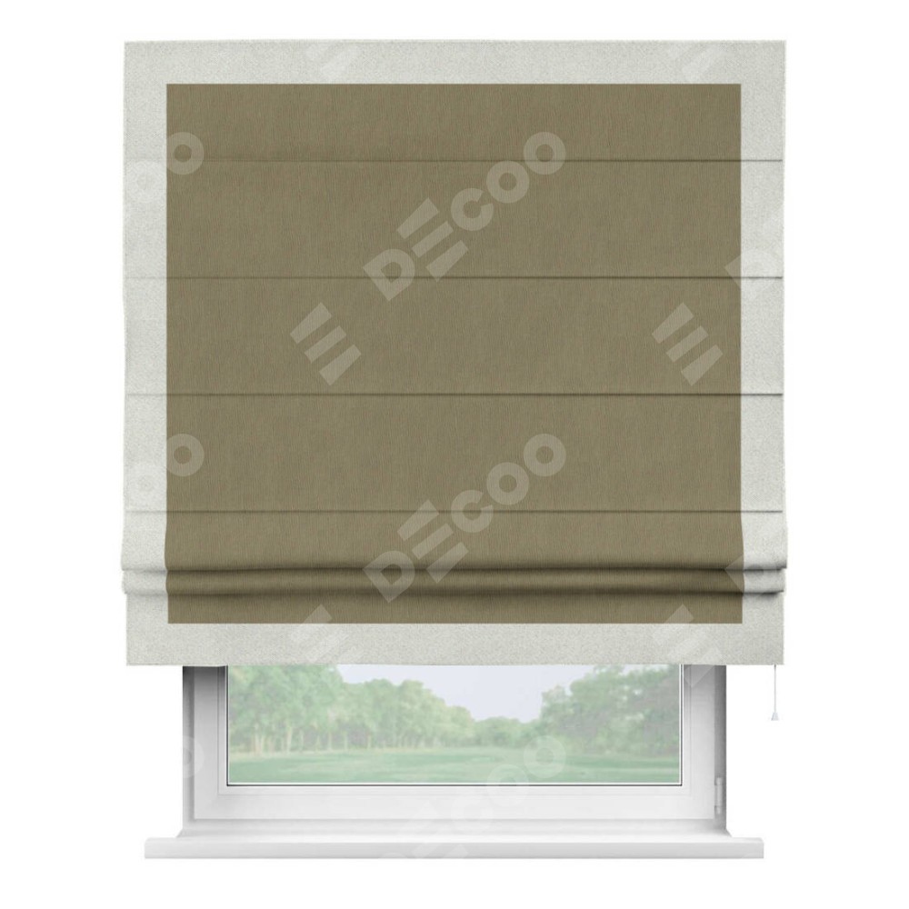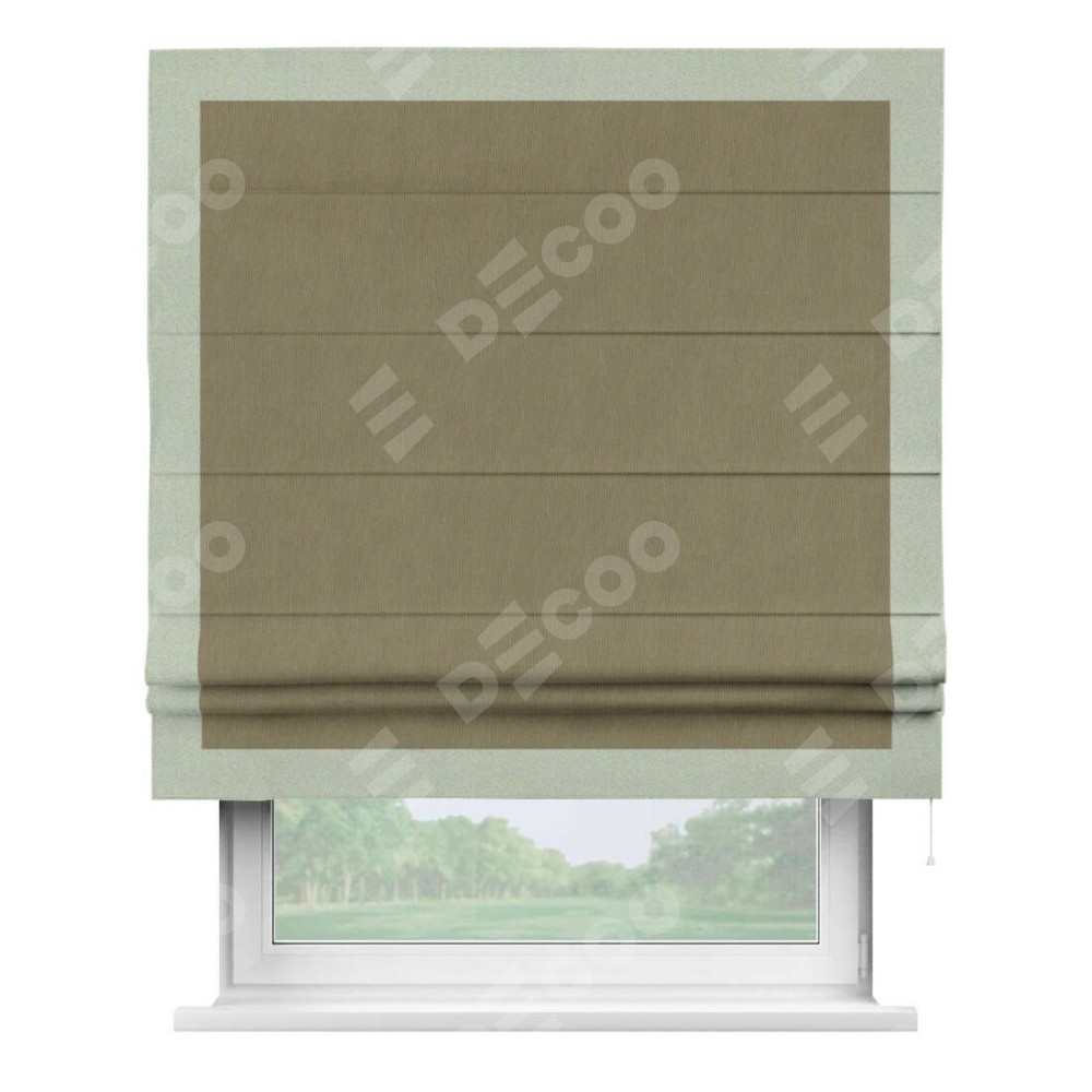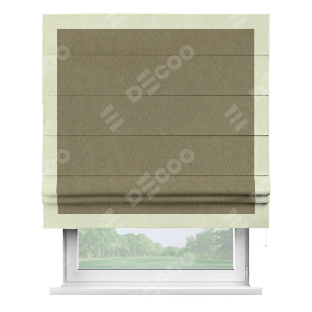 Римская штора производителя «Cortin», используется для проёма, пошита из ткани блэкаут однотонный бежево-золотой, артикул ткани 12095−2. Отделка шторы кантом «Чесс», ткань для канта используется из блэкаута однотонного разной расцветки на выбор. Имеет универсальный механизм и подходит для монтажа: на потолок, на стену и в нишу.