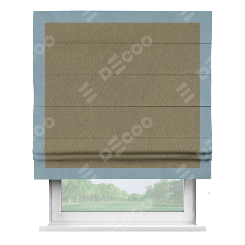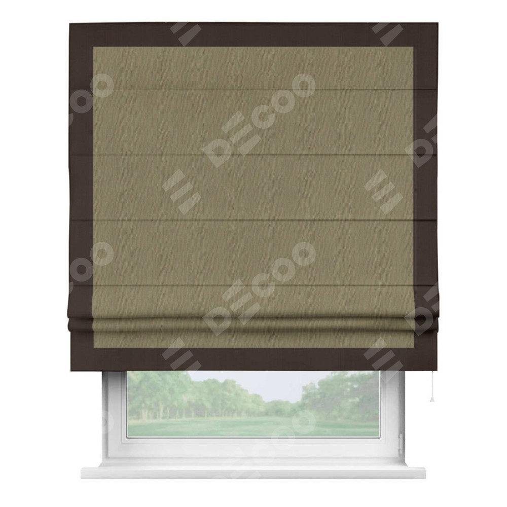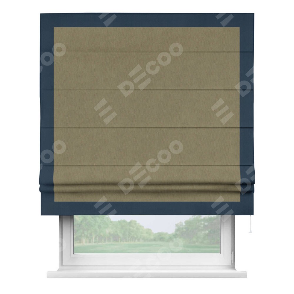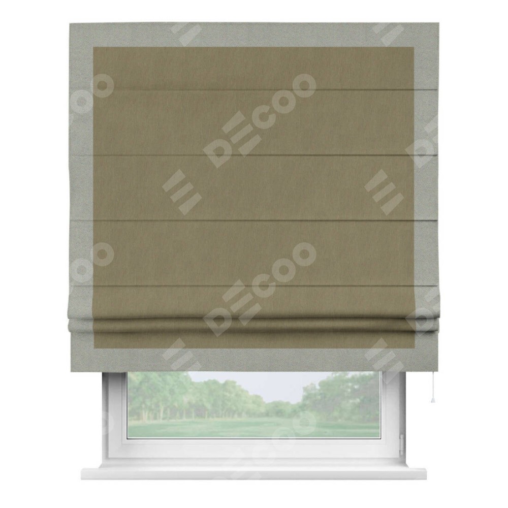 Римская штора производителя «Cortin», используется для проёма, пошита из ткани блэкаут однотонный бежево-золотой, артикул ткани 12095−2. Отделка шторы кантом «Чесс», ткань для канта используется из блэкаута однотонного разной расцветки на выбор. Имеет универсальный механизм и подходит для монтажа: на потолок, на стену и в нишу.