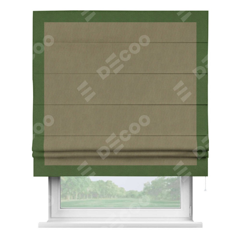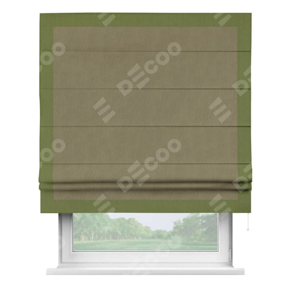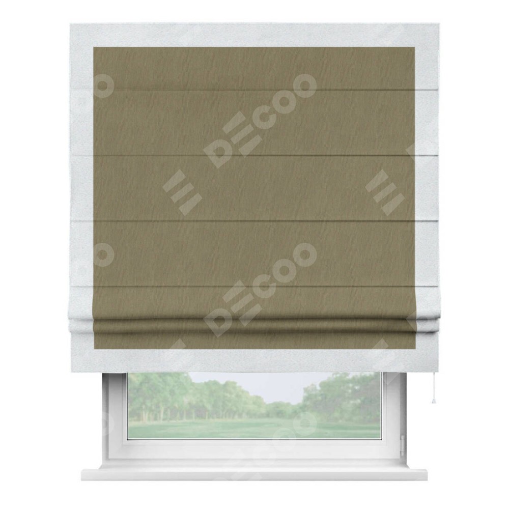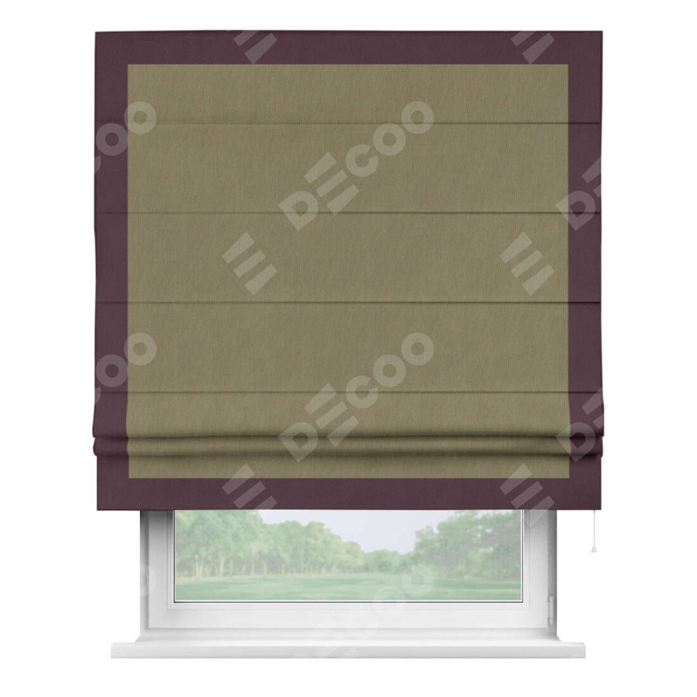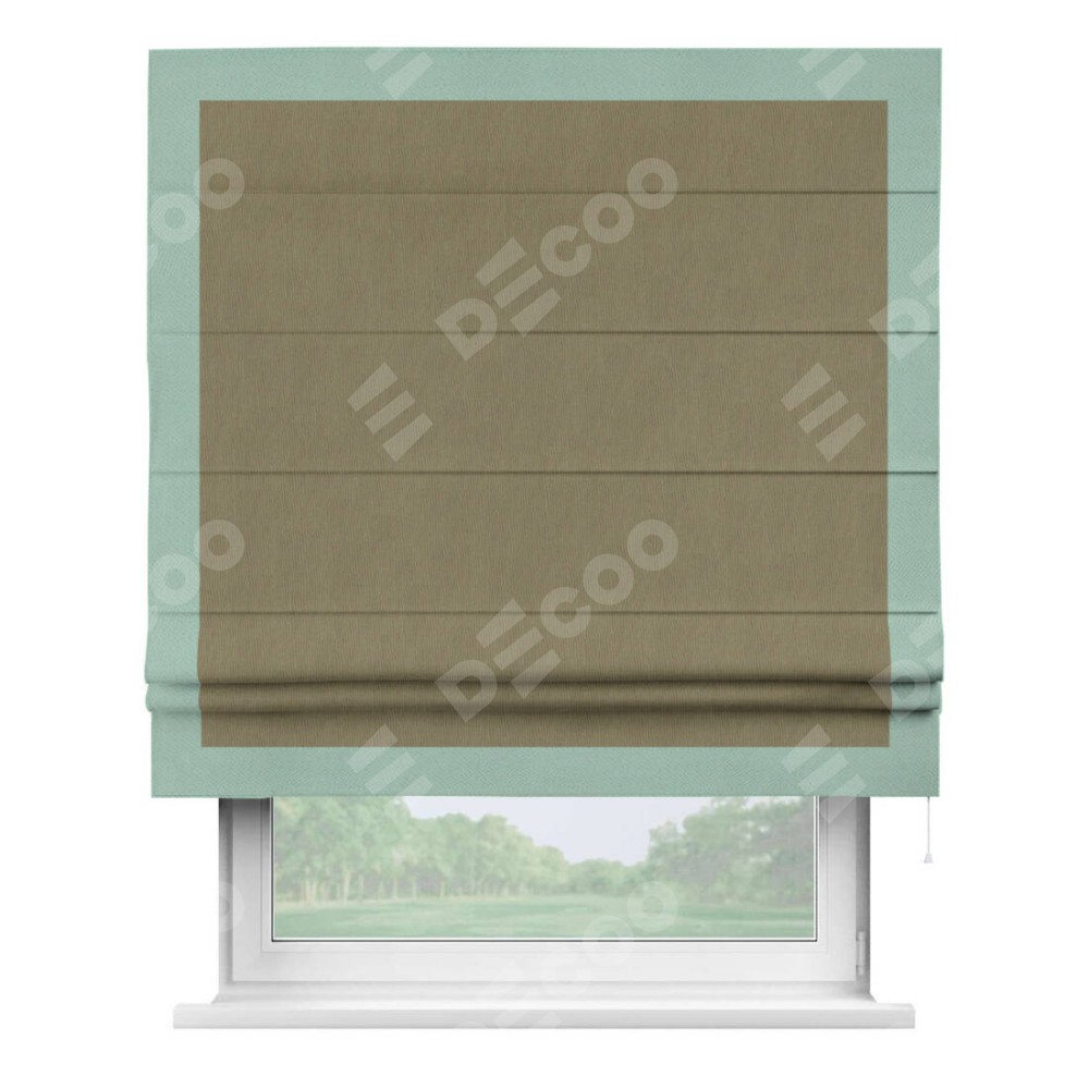 Римская штора производителя «Cortin», используется для проёма, пошита из ткани блэкаут однотонный бежево-золотой, артикул ткани 12095−2. Отделка шторы кантом «Чесс», ткань для канта используется из блэкаута однотонного разной расцветки на выбор. Имеет универсальный механизм и подходит для монтажа: на потолок, на стену и в нишу.