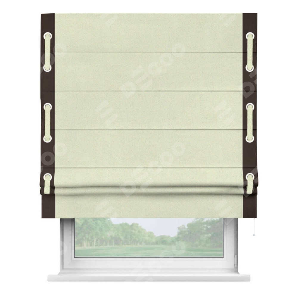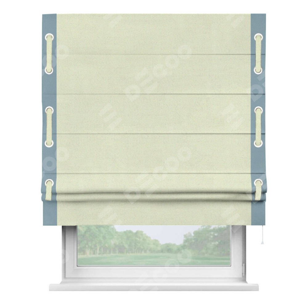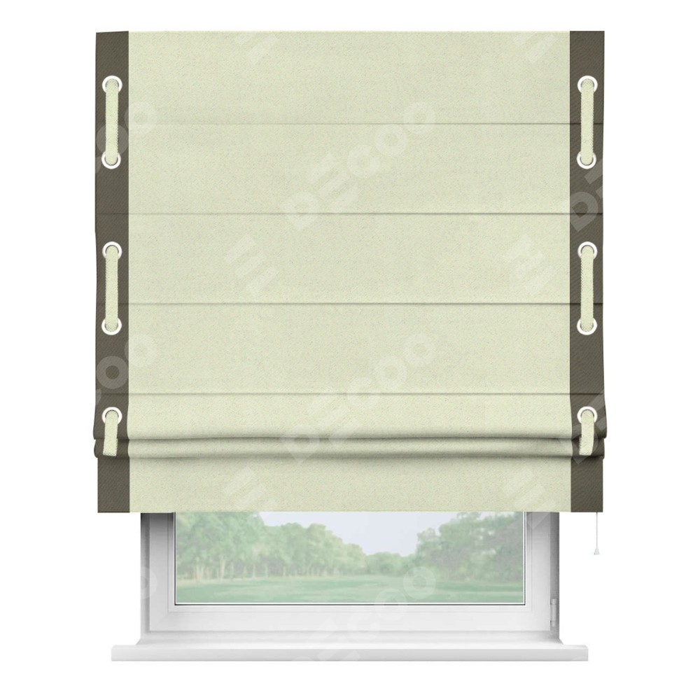 Римская штора производителя «Cortin», используется для проёма, пошита из ткани блэкаут однотонный сливочный, артикул ткани 6668−02. Отделка шторы кантом «Стрим Дуо» на кантах расположены люверсы с пояском, ткань для канта используется из блэкаута однотонного разной расцветки на выбор. Ткань для пояска обычно используется из основной ткани шторы, а так же можно сделать из любой расцветки по желанию. Имеет универсальный механизм и подходит для монтажа: на потолок, на стену и в нишу.
