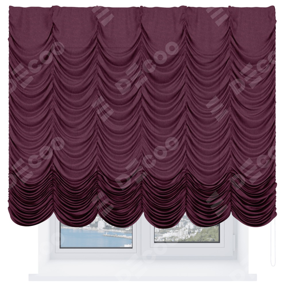 Французская штора производителя «Cortin», используется для проёма, пошита из ткани лён кашемир бордовый, артикул ткани 21621. Имеет универсальный механизм и подходит для монтажа: на потолок и на стену.